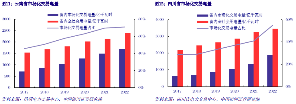 电改持续深化,水电市场化交易电量占比逐年提高。2015年第二次电改启动以来,市场化交易电量比重大幅提升。以四川、云南前两大水电省份为例,近年来水电发电量占比均超过75%,因此四川、云南整体市场化交易电量能够反映水电参与市场化交易的情况。2017-2022年间,云南省市场化交易电量占比由45.7%提升至70.1%,年均增加4.9pct;四川省市场化交易电量占比由28.7%提升至54.9%,年均增加5.2pct。