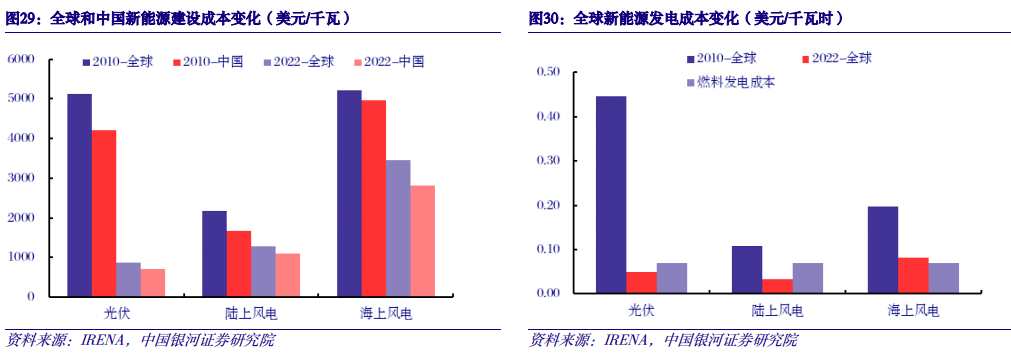 四、新能源:能源转型下主力电源,量、价成长空间大 (一)光伏陆风已实现平价上网,产业链价格继续走低 技术迭代更新推动成本下降,光伏和陆上风电已实现平价上网。2022年,全球光伏、陆上风电、海上风电平均建设成本分别为876美元/千瓦、1274美元/千瓦、3461美元/千瓦,较2010年分别下降83%、42%、34%;2022年,全球光伏、陆上风电、海上风电平均发电成本分别为0.049美元/千瓦时、0.033美元/千瓦时、0.081美元/千瓦时、较2010年分别下降89%、69%、59%;与燃料发电成本0.069美元/千瓦时相比,光伏、陆上风电已具有成本优势。
