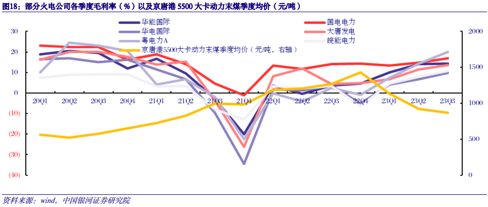 2022-2023年火电企业盈利能力持续改善。我们统计了近3年火电央企与部分省属火电企业单季度盈利能力。2020年全年煤价低位运行,各企业整体毛利率在15~20%;2021年全年煤价持续走高,京唐港5500大卡动力末煤全年均价同比上涨49%,各企业盈利水平下降明显,至2021年第四季度整体毛利率下滑至-30%~-20%;2022年全年煤价继续上行,京唐港5500大卡动力末煤全年均价同比上涨48%,但电价上浮20%大幅缓解了燃料成本上涨的压力,各企业整体毛利率水平修复至0~5%;2023年以来煤价波动下行,1-11月京唐港5500大卡动力末煤均价同比下降24%,煤电企业盈利继续修复,第三季度各企业毛利率水平提升至10~20%。
