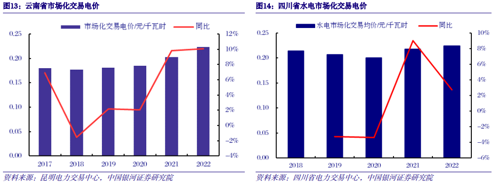水电市场化电价波动上行。以云南省为例,为解决水电消纳问题,2017年末-2018年初云南省政府发文支持引进电解铝等高耗能行业,同时给予电价补贴优惠,并开始从山东、河南、山西、甘肃等省份承接电解铝产能。在优惠政策刺激下,神火集团、其亚集团、中铝集团、山东魏桥等企业纷纷将部分产能转移至云南,使中国铝产业“北铝南移、东铝西移”的产业布局进一步加速。2017-2022年,云南省全社会用电量从1538亿千瓦时增长至2138亿千瓦时,年均增速达到9.6%。在此期间,省内用电量增速开始反超发电量增速,省内电力需求趋紧。在此背景下,云南省市场化电价波动上行,2017-2022年度市场化交易均价由0.180元提升至0.223元,复合增速4.4%。