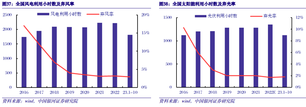 政策保障下,新能源利用效率维持高位。我国出台多项政策保障可再生能源并网消纳,国家能源局印发的文件中指出,要建立保障性并网、市场化并网等并网多元保障机制,各省(区、市)完成年度非水电最低消纳责任权重所必需的新增并网项目,由电网企业实行保障性并网。2023年1-10月,全国并网风电利用小时数为1816小时,同比减少1小时,弃风率2.9%;太阳能发电利用小时数为1120小时,同比减少52小时,弃光率为1.8%。在政策保障下,我国新能源发电利用效率维持高位。