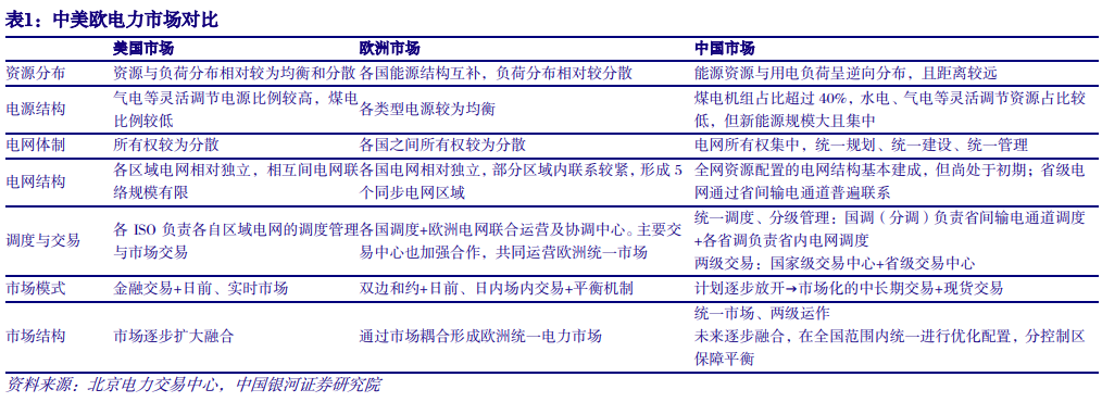 (二)电力市场展望:电量交易精细化,电力价值多维化 资源禀赋决定我国应形成“构建大电网、融入大市场”的发展格局。电力市场的发展有其路径依赖,历史与现实条件、物理和社会环境决定其发展路径不唯一,需要积极探索建设具有中国特色的电力市场体系。我国能源资源与生产力逆向分布,80%以上的煤炭、水能、风能和太阳能资源分布在西部和北部地区,70%以上的电力消费集中在东中部地区,能源基地距离负荷中心1000-4000公里。随着中东部负荷和“三倍”地区新能源装机规模持续增长,电力电量平衡及清洁能源消纳仅依赖本省、本区域已难以为继,电力电量平衡已由“分省分区”平衡全面向“全网统一平衡”转变,客观上要求构建大电网、大市场,实现大范围优化配置。截至6月底,我国“西电东送”输电能力已超过3亿千瓦,其中跨省跨区直流通道度夏期间最大输电能力可达1.8亿千瓦。