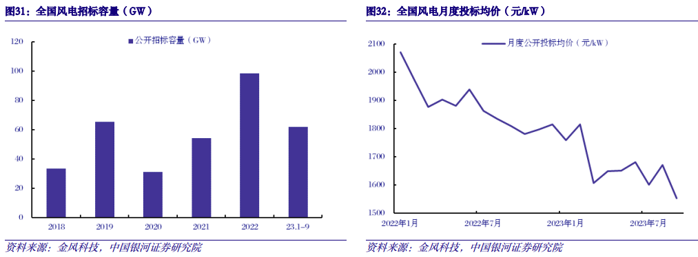 风机招标价格持续下降。2022年以来,受到补贴退坡、行业竞争加剧等影响,风机招标价格进入下行通道。根据金风科技统计数据,2023年9月全国风机投标均价为1553元/千瓦,年初至今下跌12%,较2022年年初下跌25%。