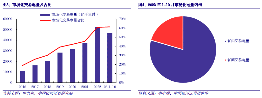 市场交易规模持续扩大,市场电比例超过60%。根据中电联《2023年1-10月份全国电力市场交易简况》, 1-10月,全国各电力交易中心累计组织完成市场交易电量46578亿千瓦时,同比增长8.1%,占全社会用电量比重为61.3%,同比提高1.2个百分点。省内交易电量合计为37048亿千瓦时,其中电力直接交易35454.3亿千瓦时(含绿电交易414.3亿千瓦时、电网代理购电7201.4亿千瓦时)、发电权交易1480.5亿千瓦时、其他交易113.2亿千瓦时。省间交易电量合计为9530亿千瓦时,其中省间电力直接交易1059.4亿千瓦时、省间外送交易8370亿千瓦时、发电权交易100.6亿千瓦时。