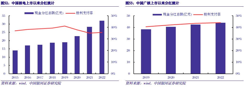 (三)远期厂址支持6倍成长空间,对比水电估值优势明显 核电盈利确定性高,板块分红逐年上涨。核电与其他清洁能源相比,不需要靠天吃饭,不受来水、来风、光照等天气因素影响,是属于出力稳定的基荷电源。从运行成本来看,虽然核电需要依靠核燃料发电,但燃料成本占比仅为25%左右,其余均为折旧、运维、计提乏燃料处置金等相对固定的成本。因此核电项目运行后盈利能力较为稳定,近年来中国核电和中国广核核电业务毛利率在40-50%左右。从远期核电项目盈利能力看,核电资产属性与水电类似,折旧年限远低于使用寿命,折旧完成后盈利能力在保持稳健的基础上有望实现进一步提升。随着新项目投运带动发电量稳健增长,中国核电和中国广核分红逐年增长。