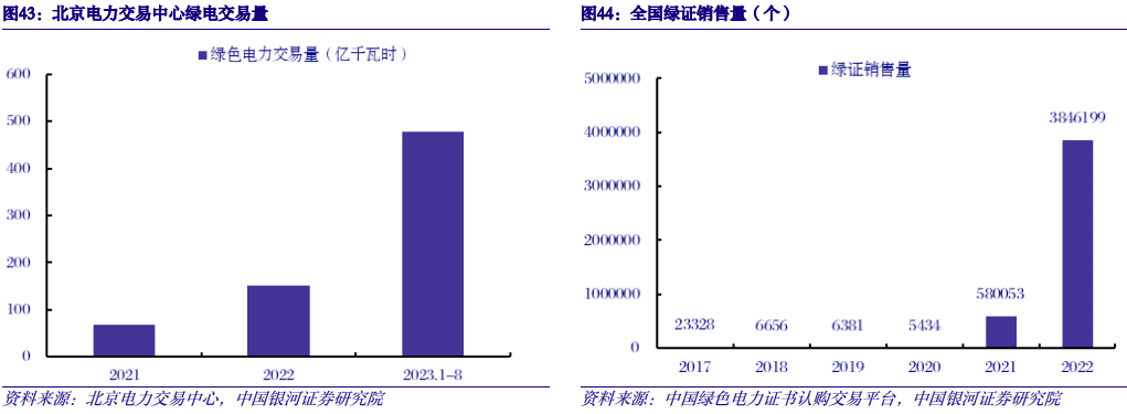 绿电、绿证交易规模快速增长,潜在增长空间广阔。2022年风光发电量1.2万亿千瓦时,绿电+绿证交易<300亿千瓦时,同比增长超过200%,占比仍低于3%。由于绿色环境价值体系待完善、跨区域绿电交易规模有限、交易规则待健全、绿电绿证和碳市场衔接等原因,绿电和绿证交易规模受限。