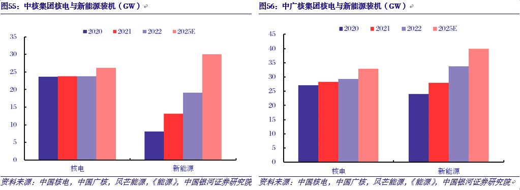 中核、中广核集团依托核电优势发展新能源,打开第二成长空间。中核、中广核集团依托核电厂址土地、核工业产业等优势,大力发展新能源,推动集团绿色低碳转型。根据规划,中核集团、中广核集团2025年新能源装机将分别达到30GW、40GW;2022-2025年间,中核集团、中广核集团新能源年均新增装机将分别达到3.6GW、2.1GW。