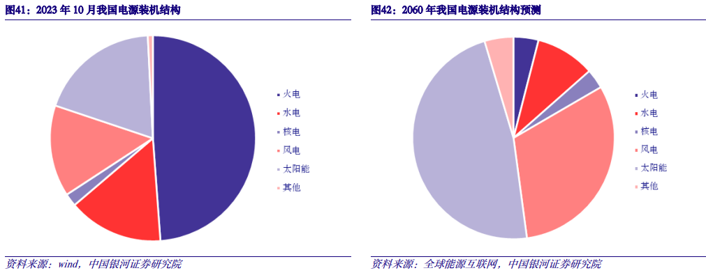 (三)能源转型打开长期成长空间,环境价值带来额外电价弹性 1. 装机:2025、2030年累计装机超过14亿千瓦、20亿千瓦 “双碳”目标驱动能源转型,长期来看风光将成为主力电源。目前新能源已成为新增装机主力,2023年1-10月新能源新增装机1.8亿千瓦,占比超过70%。截至2023年10月,风电、太阳能累计装机4.04/5.36亿千瓦,同比+15.6%/+47.0%。新能源累计装机合计9.4亿千瓦,占总装机33%。产业链降本刺激装机需求,能源转型打开长期增长空间,我们预计2025年、2030年风光累计装机将超过14亿千瓦、20亿千瓦。根据全球能源互联网发展合作组织的预测,到2060年我国发电装机容量将达到80亿千瓦,其中清洁能源装机76.8亿千瓦,占比96%;2060年风电和太阳能装机分别达到25亿千瓦和38亿千瓦,风光装机占比接近80%,发电量占比接近70%。