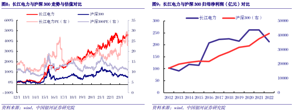 盈利稳定性促进估值上行,带动水电板块超额收益。以水电龙头长江电力为例,2012年至今,长江电力涨幅357%,沪深300仅为50%,超额受益主要由于估值提升而非业绩增长。以PE TTM统计,长江电力10年间估值水平由14.2提升至23.0,涨幅高达62%,同期沪深300估值水平由10.4提升至11.0,涨幅仅为5%。长江电力10年间归母净利润由103亿元提升至213亿元,涨幅为106%,同期沪深300归母净利润由17065亿元提升至41374亿元,涨幅为142%。
