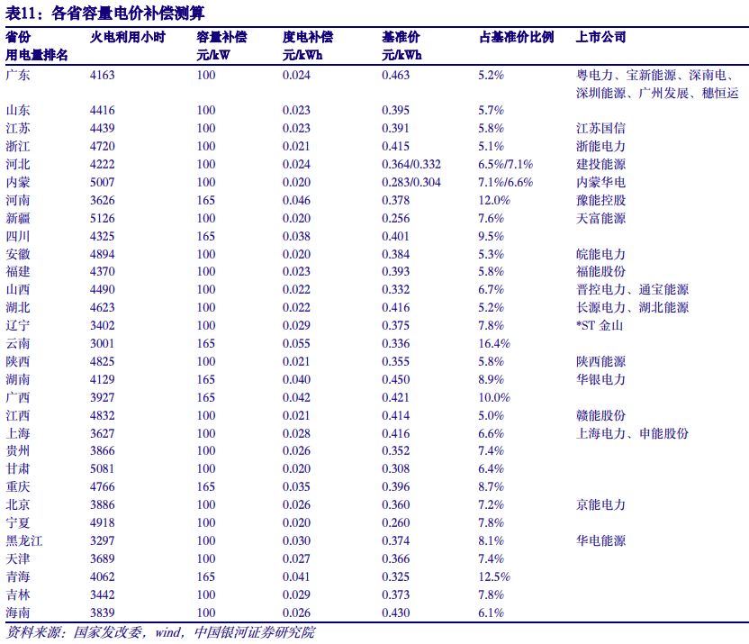 各省度电补偿水平多数位于0.02-0.04元之间。按照各省火电利用小时数计算(略低于煤电利用小时数),中东部用电大省,如广东、江苏、山东、浙江等,其火电利用小时数超过4000小时,容量补偿标准为每年每千瓦100元,对应度电补偿0.02-0.025元;新能源与水电大省,如云南、四川、青海等,其容量补偿标准为每年每千瓦165元,对应度电补偿在0.04元左右,其中云南超过0.05元。
