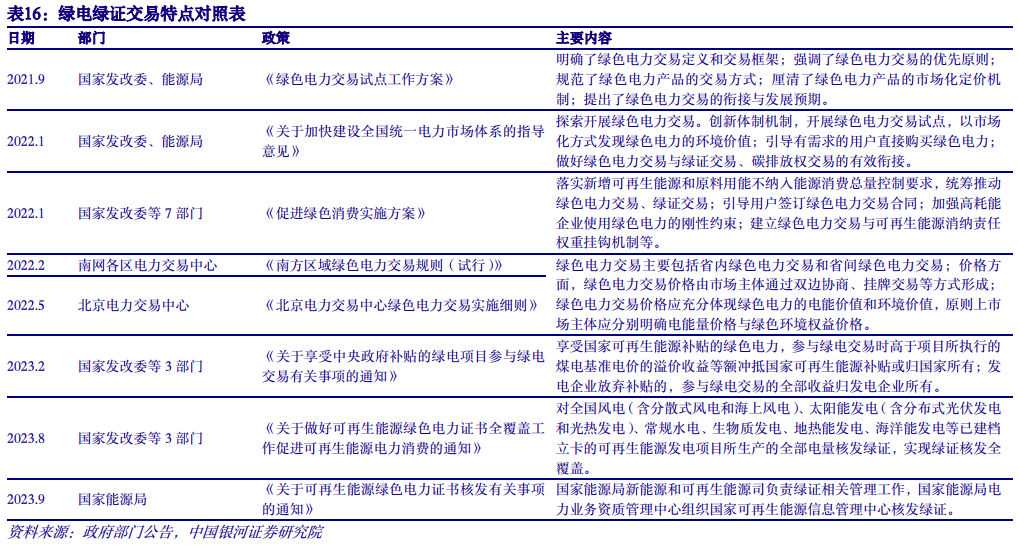 十四五以来,国家级绿电、绿证交易支持政策不断出台。《关于加快建设全国统一电力市场体系的指导意见》中提出,开展绿色电力交易试点并发现其环境价值,做好绿电交易与绿证交易、碳排放权交易的衔接;《促进绿色消费实施方案》中提出,引导用户签订绿电交易合同,加强高耗能企业使用绿电的刚性约束,并且要建立绿电交易与可再生能源消纳责任权重挂钩机制;国网以及南网下属电力交易中心也相继出台绿电交易规则,进一步细化了绿电交易的参与主体、参与方式、分类、价格等条款;2023年2月,发改体改【2023】75号文明确提出将绿电交易范围从平价项目扩展到带补贴项目。
