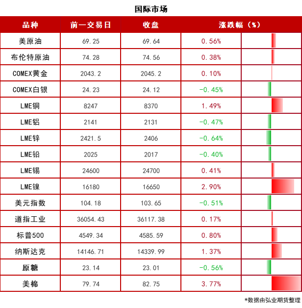 弘业期货 文:金融研究院分析师 郑重声明:本资讯内容仅供参考,据此入市,风险自担 今日关注 有声有色圆桌论坛 12月8日(周五)15:30 隔夜市场 【隔夜要闻】 据央视新闻消息,当地时间7日,俄罗斯与沙特阿拉伯发表联合声明,指出两国就未来扩大在石油和天然气领域合作方面达成一致,还决定加强在国防领域的合作。俄罗斯和沙特支持加沙地带停止军事行动。此外,俄罗斯欢迎沙特和伊朗恢复外交关系。 截至12月2日当周初请失业金人数上升至22万人,略低于预期的22.2万人。截至11月25日当周美国续请失业金人数降至186万,创下自7月以来的最大降幅,为9月初以来的第二次下降。 周四,日本央行行长植田和男谈及退出负利率后的选项,并表示12月政策制定变得更具挑战性,当日隔夜指数掉期一度显示日本央行本月结束负利率政策的几率接近45%。此前一天日本央行副行长冰见野良三暗示,日本央行可能很快就会结束世界上最后一个负利率政策,该言论是迄今为止日本央行领导层发出的最明确的信号。 美国财长耶伦:如果参与者在解读数据时“深思熟虑”,债券市场对美联储行动的预期可以成为货币政策的有益补充。 据报道,拜登政府上周警告以色列尽快结束军事行动。传递给以色列领导人的信息的细节,拜登政府官员将2024年定为结束以色列对哈马斯大规模军事行动的目标日期。 圭亚那与委内瑞拉在产油区剑拔弩张之际,美国宣布与圭亚那进行军演。 机构:自7月以来,俄罗斯乌拉尔原油价格首次跌破60美元。 国务院印发《空气质量持续改善行动计划》,严禁新增钢铁产能。推行钢铁、焦化、烧结一体化布局,大幅减少独立焦化、烧结、球团和热轧企业及工序,淘汰落后煤炭洗选产能;有序引导高炉—转炉长流程炼钢转型为电炉短流程炼钢。到2025年,短流程炼钢产量占比达15%。京津冀及周边地区继续实施“以钢定焦”,炼焦产能与长流程炼钢产能比控制在0.4左右。《空气质量持续改善行动计划》还提出,大力发展新能源和清洁能源。到2025年,非化石能源消费比重达20%左右,电能占终端能源消费比重达30%左右。持续增加天然气生产供应,新增天然气优先保障居民生活和清洁取暖需求。 中国央行:中国11月末黄金储备报7158万盎司(约2226.39吨),环比增加38万盎司(约11.82吨),为连续第13个月增持黄金储备。 海关总署:11月份出口2919.3亿美元,增长0.5%;进口2235.4亿美元,下降0.6%;贸易顺差683.9亿美元,扩大4%。 国务院印发总体方案,推进上海自贸试验区高水平开放,打造国家制度型开放示范区。 农业农村部:引导养殖场户顺时顺势出栏生猪,避免盲目压栏影响价格回升。 广期所发布调整碳酸锂期货部分合约涨跌停板幅度、交易保证金标准、交易手续费标准和交易限额。 【隔夜市场数据】