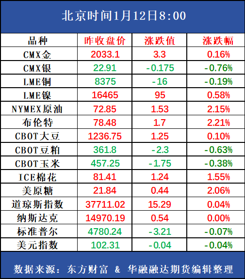 农产品 棉花 美棉签约数据表现亮眼,ICE期棉阳线收涨 【现货概述】 1月11日,棉花现货指数CCI3128B报价至16595元/吨(44),期现价差-1015(合约收盘价-现货价),涤纶短纤报价7170元/吨(+0),黏胶短纤报价12650元/吨(+0)CY Index C32S报价22640元/吨(+0),FCY Index C32S(进口棉纱价格指数)报价23051元/吨(+35);郑棉仓12760(+28),有效预报1358(-74)。美国EMOT M到港价91.8美分/磅(-0.5);巴西M到港价89.3美分/磅(-0.5)。 【市场分析】 据美国农业部发布的美棉出口数据显示,截至12月28日当周,美国2023/24年度陆地棉净签59534吨(含签约63934吨,取消前期签约4400吨),较前一周增加100%,较近四周平均增加49%。装运陆地棉51732吨,较前一周增加7%,较近四周平均增加12%。净签约本年度皮马棉453吨,较前一周增加减少5%,装运皮马棉6055吨,较前一周显著增加。签约新年度陆地棉4990吨,未签约新年度皮马棉。美棉签约环比大增,装运环比略有增加。隔夜ICE期棉主力03合约,阳线报收81.41美分/磅,期价较上一交易日上涨1.24美分/磅。从技术面来看,MACD红柱放量,DIFF与DEA拟合金叉,KDJ指标拟合死叉,技术指标有所转弱。 2023年11月美国纺织品服装进口量69.80亿平方米,同比增加1.28%,环比下降13.08%;纺服进口金额73.80亿美元,同比下降14.93%,环比下降17.17%。2023年1-11月,美国纺织品服装累计进口量为859.68亿平方米,同比下降13.65%。主要进口国及占比为: 中国(37.71%)、印度(10.21%)、越南(6.38%);纺织品服装累计进口金额974.92亿美元,同比下降20.97%。主要进口国及占比为: 中国(24.59%)、印度(8.47%)、越南(14.09%)。目前 纯棉纱市场交投尚可,但较前两周有所放缓。棉纱价格偏强运行,但同时上涨阻力开始增加。下游后续将逐步进入收尾阶段,预计交投将逐渐走弱。 【技术分析】 隔夜郑棉主力05合约阴线报收15580元/吨,期价较上一交易日上涨95元/吨, 持仓减少654手,至58.7万手。从周氏超赢技术面来看,ck模式显示多,F2指标显示多、资金流量指标显示多,技术指标有所转强。 【操作策略】 建议轧花企业关注趋势性套保机会,或者根据企业自身情况利用衍生品工具做好风险管控。(仅供参考) 棉纱 向下滑动可查看更多内容↓ 备货行情接近尾声,棉纱市场走货略有降温 【现货概述】 1月11日,棉花现货指数CCI 3128B报价至16595元/吨;CY Index C32S报价22640元/吨;FCY Index C32S(进口棉纱价格指数)报价23051元/吨;部分地区棉纱价格: 现河南大厂产紧密纺JC40S带票到货29000元/吨 四川产C60S带票到货价28000元/吨 【市场分析】 近几天坯布市场走货氛围较前期走弱,下游询价减少,贸易商囤货接近尾声。织厂反映年后订单尚不足,织厂对年后行情谨慎看待,目前生产年前订单为主。本周纺企棉纱库存仍处于下降趋势,但成交量不及上周,预计棉纱上方空间有限,棉纱期价运行区间20000-22500元/吨继续关注棉纱市场走货情况。 【策略建议】 建议下游织厂可待盘面接近下方支撑位置时在盘面建立虚拟库存。(仅供参考) 花生 向下滑动可查看更多内容↓ 上下两难窄幅震荡 整体购销趋于清淡 【市场动态】 现货情况:内贸市场到货量不大,贸易商随销随采为主,市场年前备货现象暂未显现,整体购销偏慢,价格基本稳定。 油厂情况:油厂到货量普遍不大,成交价格基本平稳,部分油厂仍有一定拒收、复检情况,近几日部分油厂指标略有放松。(精英网资讯) 【主要逻辑】 1)头部油厂全面入市,元旦春节备货接力,产区现货震荡趋稳。 2)基层货源从农户陆续转移至中间商,春节前上游抛压难有集中兑现。 3)国内油料供应充裕,规模油厂进口订单偏少,运力风波影响有限。 4)主要矛盾仍在基层上货,虽驱动向下,抛压预期持续,但估值透支,仍需耐心等待现货反馈。 【策略建议】 PK2403报收于8884元/吨,涨幅1.12%,持仓减2605手至13.64万手;PK2404报收于8798元/吨,涨幅0.57%,持仓增1693手至4.6万手。短期行情上下两难,盘面维持窄幅震荡。3月基差有走弱驱动,3-4正套波段操作。 生猪 向下滑动可查看更多内容↓ 期价震荡调整 【期货方面】 主力合约(LH2403)今日震荡调整,日内最高价13525元/吨,最低价13375元/吨,收盘于13490元/吨,盘面贴水河南地区生猪出栏价540元/吨。 【现货方面】 据涌益咨询数据显示,1月11日全国生猪出栏均价13.47元/公斤,较昨日-0.18元/公斤。养殖端出栏积极性尚可,终端需求反季节走弱,猪价稳中偏弱调整。 【盘面逻辑】 03合约空头:①出栏量仍处高位;②年后需求淡季;③屠企冻品库存率仍处高位,年后分割入库需求少;多头:①年前阶段性抛售或导致元月、年后出现小断档;②年后或有二育抄底。 【后市展望】 终端需求持续走弱,在春节备货未开启前,猪价或持续低位震荡。对于年后猪价来说,仍不容乐观,主要原因在于:①生猪出栏量处于高位,现在虽有提前出栏但难形成质的改变;②年后淡季,需求差,难以支撑猪价上涨;③屠企冻品库存率仍处高位,年后分割入库需求小。 【策略建议】 逢高空03合约(仅供参考,不作为入市依据)。 苹果 向下滑动可查看更多内容↓ 冷库货价格偏弱,盘面触底反弹 【现货简述】 全国苹果(红富士80#二级以上)平均批发价格为8760元/吨。(数据来源:中国果品流通协会) 全国库存数据:截至2024年1月11日 上海钢联:全国主产区苹果冷库库存量为902.75万吨,库存量较上周减少16.68万吨。 卓创资讯:全国冷库目前存储量约为830.45万吨,本周冷库单周出库量为16.37万吨。 目前,山东产区已有少量客商