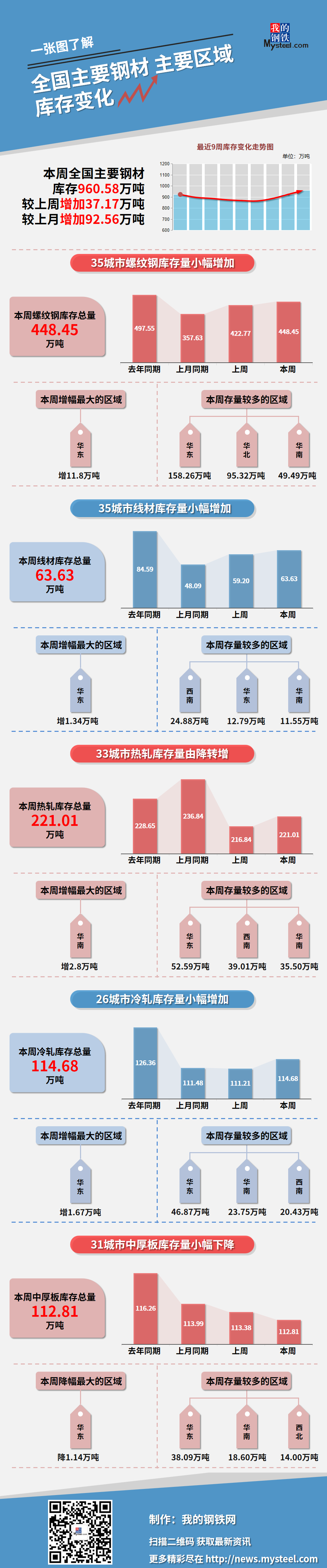 本周,全国主要钢材社会库存960.58万吨,较上周增加37.14万吨,较上月增加92.56万吨;螺纹钢库存总量448.45万吨。