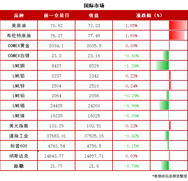 弘业期货 美国证监会SEC在社交媒体发帖宣布比特币ETF,后又澄清并未批准,是遭到黑客攻击后的黑客所为。比特币在此期间大幅波动逾3000美元,全网加密货币一小时内超4000万美元资金爆仓。 据经纪商和交易所的数据,最近几天,相当于约3000万桶的5月和6月布伦特原油看涨期权价差合约达成交易,押注未来几个月油价突破110美元。 EIA短期能源展望报告:2024年全球原油需求增速预期上调5万桶/日至139万桶/日,此前预期为134万桶/日。 数据显示,俄罗斯去年12月原油产量降幅为减产开始以来最大,下降至957万桶/日。 大幅降价后,印度拟增加沙特原油进口。 沙特内阁声明:沙特阿拉伯强调支持稳定石油市场的努力。 红海危机-赫伯罗特:继续绕道好望角并在1月15号做出下一步行动的评估;英国海军在也门荷台达以西50海里处收到事故报告;也门军方消息人士:胡塞武装瞄准红海船只。 以色列外长证实以方暗杀黎真主党高级指挥官。 商务部、中央台办、国家发展改革委、工业和信息化部联合印发《关于经贸领域支持福建探索海峡两岸融合发展新路若干措施的通知》:支持福建扩大对台开放合作。 国家发展改革委、商务部、市场监管总局发布支持广州南沙放宽市场准入与加强监管体制改革的意见 :推动在南沙实施外国人144小时过境免签政策。 工信部就《云计算综合标准化体系建设指南》(征求意见稿)公开征求社会各界意见,意见稿拟定到2027年,制定云计算国家标准和行业标准达50项以上。 2023年12月以后,北交所新股有效申购户数较此前一个月增加了3倍。 证监系统持续释放从严监管信号。截至1月9日,已有包括券商、会计师事务所等在内的16家中介机构领了罚单。 国家金融监管总局公司治理司提出,加强对保险集团和金融控股公司机构监管,研究建立规则趋同或统一的金融集团非现场监管框架,强化股东和董监高人员资质要求。