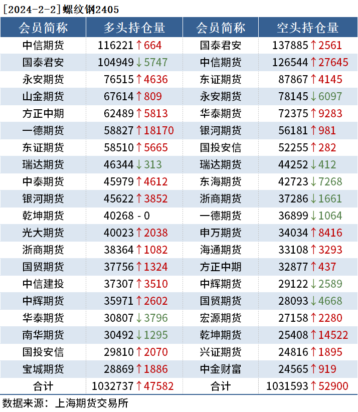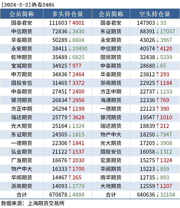 截至2月2日收盘,螺纹钢2405收3825元/吨,跌1.19%;热卷2405收3967元/吨,跌0.95%;铁矿石2405收941元/吨,跌2.23%。