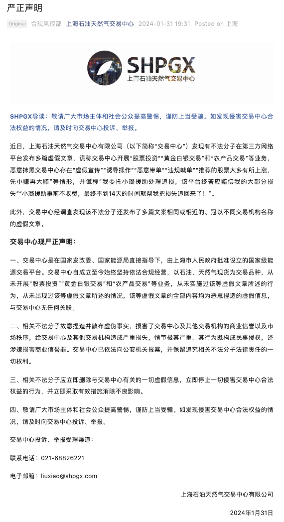 央视网消息:1月31日,上海石油天然气交易中心有限公司发布声明称,交易中心自成立至今始终坚持依法合规经营,以石油、天然气现货为交易品种,从未开展“股票投资”“黄金白银交易”和“农产品交易”等业务,从未实施过该等虚假文章所述的行为,从未出现过该等虚假文章所述的情况,该等虚假文章的全部内容均为恶意捏造的虚假信息,与交易中心无任何关联。交易中心已依法向公安机关报案,并保留追究相关不法分子法律责任的一切权利。