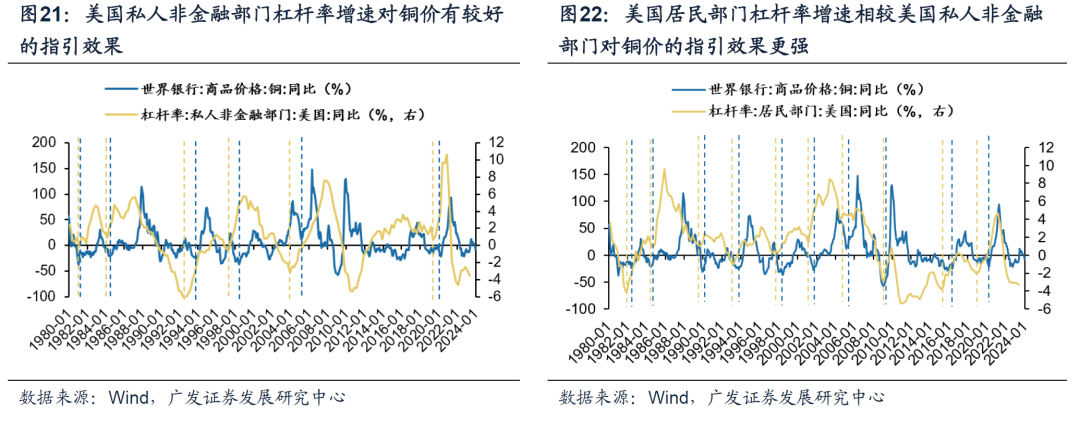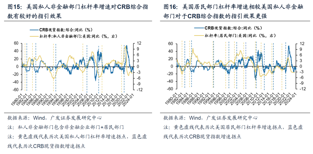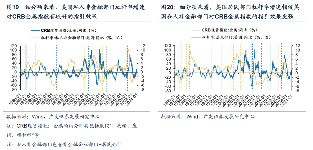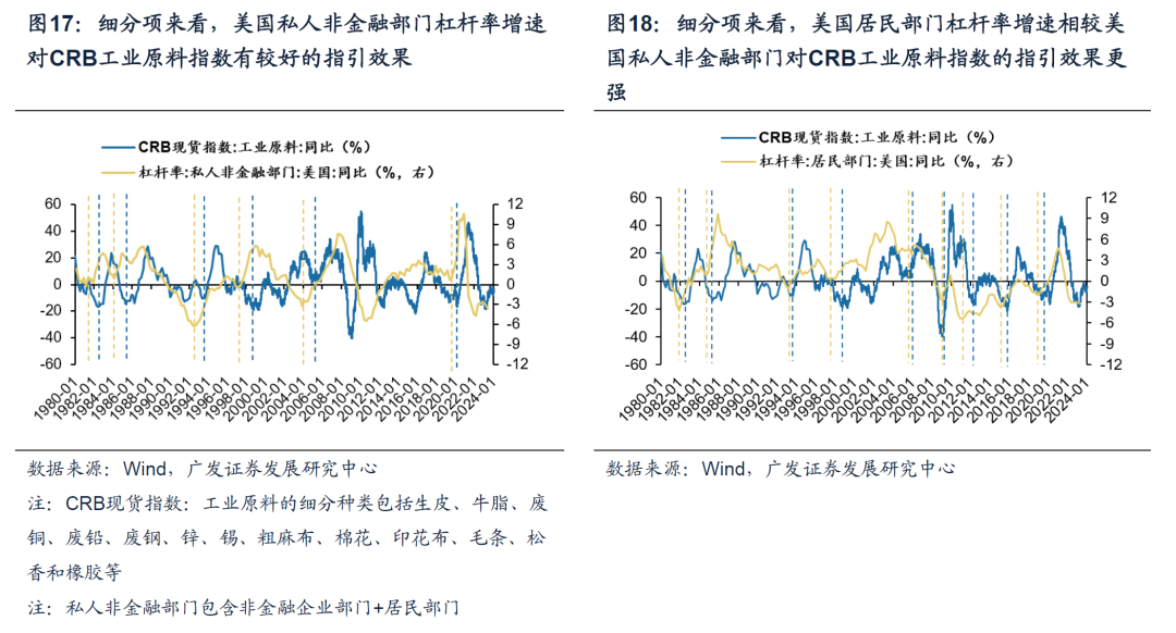 大宗商品分项来看,我们主要锚定三类市场关注度较高且与经济生产景气度联系紧密的细分商品做进一步的研究,包括:工业金属、工业原料、能源,并得出以下几点结论: (1)分项来看,债务周期框架下的商品定价逻辑仍然有效,美国私人部门杠杆率增速对工业金属、工业原料、能源的价格同样有较好的指引。 (2)分项来看,美国私人部门杠杆率增速对工业金属&工业原料的指引效果相较于能源更显著。我们认为原因在于,债务周期视角更多提供了大宗商品需求侧的分析框架。而从供给端来看,能源供给的刚性约束一定程度上大于工业金属&工业原料。能源,尤其以石油为例,供给侧经常会受到地缘政治冲突等外生因素影响。 1.工业金属&工业原料 美国私人非金融部门杠杆率增速往往领先CRB现货工业原料&金属指数增速平均6-12个月,其中“居民部门杠杆率”的指引效果更加显著。进一步细化,作为最能敏锐捕捉宏观变化的工业金属之一,债务周期框架下“铜博士”的定价逻辑同样有效,美国私人非金融部门杠杆率增速对铜价有较好的指引效果。