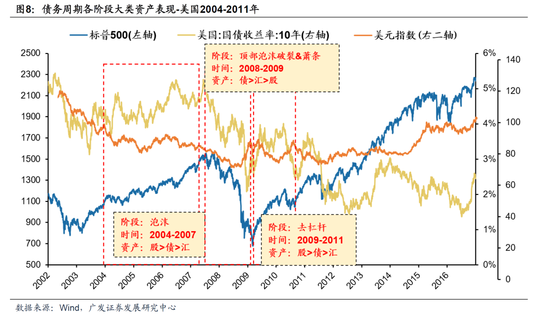 案例二:2004-2011美国 (1)泡沫阶段(2004-2007):股>债>汇。2001年互联网泡沫破裂后,美联储将利率从6.5%不断降低至接近零利率。低利率环境促进个人和机构在房地产领域的投资。在此期间,美国家庭的债务与可支配收入占比由85%左右上升到了120%左右。投资者对于房地产市场的过度乐观以及个人、机构投资者的高杠杆投融资方式共同孕育了房地产市场的泡沫。根据房地美房价指数,美国房地产市场2004-2006年上涨了约26.45%。 (2)顶部泡沫破裂&萧条阶段(2008-2009):债>汇>股。美国次级抵押贷款市场泡沫破裂,信贷市场崩溃,随后房地产市场下挫,银行系统陷入危机,美国进入了泡沫破裂与萧条阶段。2008年6月失业率飙升至5.6%,制造业活动连续4个月下降,消费者信心指数创多年新低。2008年9月,雷曼兄弟的破产成为金融危机的标志性事件。截止2008年11月19日,标普500指数从2007年10月的峰值下跌约52%。 (3)去杠杆阶段(2009-2011):股>债>汇。危机过后美国开始实施刺激计划以振兴经济,进入去杠杆阶段。在财政政策方面,实施了包括《美国复苏与再投资法案》在内的一系列政策,这一刺激计划总额为7870亿美元,其中2880亿美元专门用于减税,1440亿美元用于州和地方政府,1050亿美元用于基础设施,其余用于联邦支出计划;在货币政策方面,2008年下半年开始实施量化宽松政策,降低隔夜利率至降至有史以来的最低水平(0%-0.25%)以刺激经济复苏。
