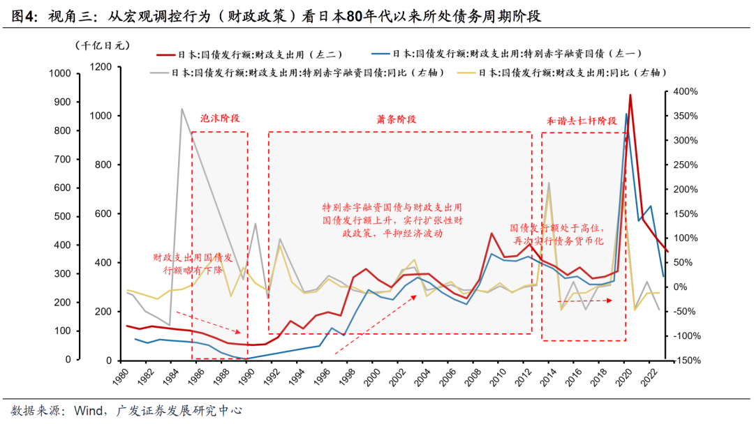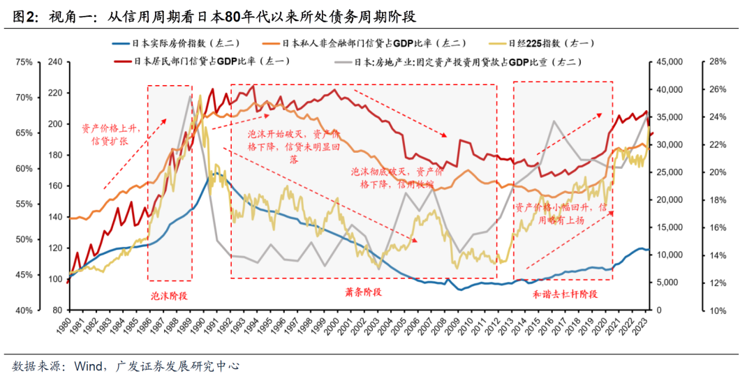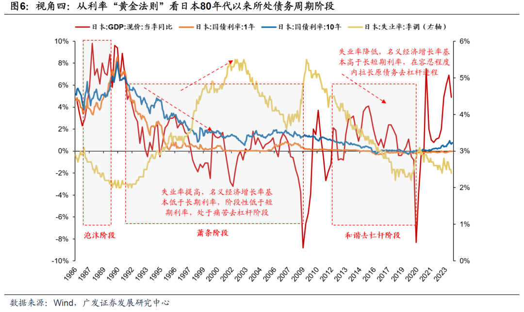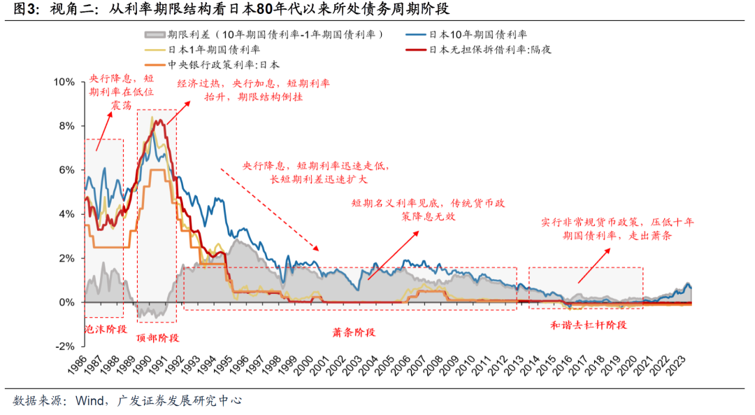 (二)债务周期“六阶段论”如何定位日本90年代?——四大视角 我们从信用周期&资产价格、利率期限结构、宏观调控行为以及“利率黄金法则(Golden rule)”四个角度识别80年代以来日本所处债务周期的具体阶段:泡沫阶段(1987-1989)、顶部破灭(1990-1992)、萧条阶段(1993-2013)以及和谐的去杠杆阶段(2013-2020)。 视角一:从信用周期来看,信用扩张与收缩通过影响资产价格,可能进一步表现为泡沫的膨胀与破灭。在泡沫阶段,信用扩张带来的资金流入资本市场刺激资产价格上扬。在银行信贷信息不对称的情形下,信贷往往又取决于抵押品的价格。资产价格的上扬为信用扩张提供基础,继而循环往复。信用扩张到一定程度致使资产价格远离理论价格,造成泡沫膨胀。而在泡沫顶部破灭时,由于资产价格的下跌,信用在收缩的同时会引发资产价格的进一步下跌,最终资产价格向理论价格方向回落。