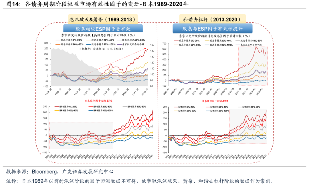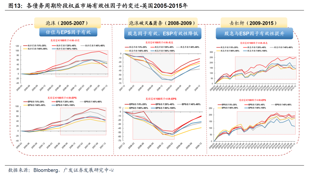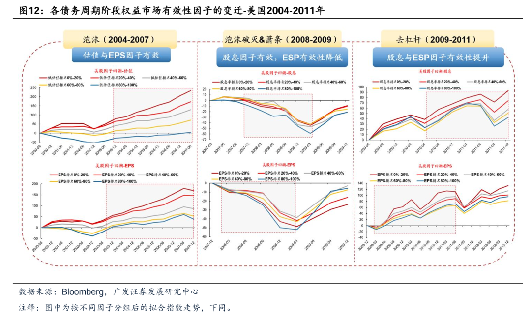 (二)股市有效性因子在不同债务周期阶段的变迁路径 同样以美国、英国、日本等经历的典型债务周期为例,我们会发现权益市场中的具备有效性的因子随着所处债务周期阶段的变化,而形成相似的变迁路径: (1) 在泡沫形成阶段,估值与EPS是较为有效的两个因子,防御性策略在杠杆率高位时受到市场青睐。 (2) 在泡沫破灭进入萧条阶段后,EPS因子的有效性显著降低,股息率因子相对而言更加有效,高股息组合显著跑赢。 (3) 在进入和谐的去杠杆阶段后,股息率因子与EPS因子的有效性会进一步提升,其中股息率因子更为有效。以最典型的日本为例,在杆杆率趋势下行后,高股息组合的超额收益实际上相较之前更为明显,显示高股息策略在市场长期风险出清的过程中持续占优。