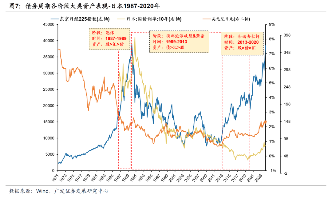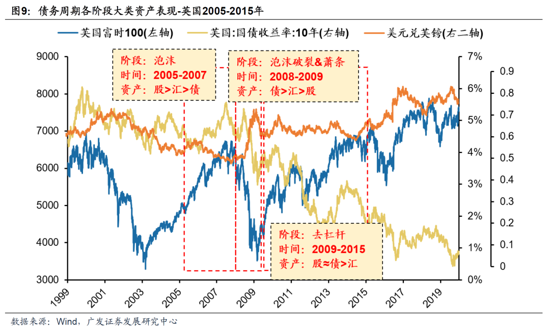 综合以上维度,我们可以结合债务周期阶段论对日本90年代及前后做如下的定位—— 1. 1.泡沫阶段1987-1989:(1)1987年以来,日本信贷水平扩张明显。日本非金融部门贷款占GDP比重从1987Q1的170.2%上行至1989Q4的201%,同期日本居民部门贷款占GDP比重上升13pct,皆处于快速上行通道。除了全行业,聚焦房地产行业,其固定投资贷款占GDP比重于1989年达到25.46%,处于观测时段的顶峰水平。资产价格也迅速上升。日经225指数在1987Q1-1989年底期间涨幅高达94%。(2)1987年初至1989Q1政策利率降至2.5%,为萧条前的最低水平。此时期短期利率也在低位震荡,助长泡沫形成。(3)1990年以前,财政支出用国债发行额略有下降。宽松货币政策下,此时期广义货币占GDP比重呈快速上升趋势。M2增速与M1增速敞口收窄表明此时期市场流动性趋于宽裕。(4)名义经济增速大于长短期利率,失业率回落至历史低位,企业融资成本相对较低,生产规模快速膨胀。(数据来源为wind,如无特别说明,下同) 2.顶部1989-1992:(1)1990年以后,日经225指数开始下跌,实际房价指数虽然在1990-1991Q1仍有增长,但增速放缓至6.5%。与泡沫阶段年平均增长率相比,下降了两个百分点。房价指数于1991Q1见顶后开始回落。1990-1992年非金融部门与居民部门信贷规模保持高位水平甚至略有上升,但扩张规模明显放缓。这与我们在《“债务周期大局观”系列(二)》中所提到的“低增长,低通胀”的宏观环境以及IPO规模萎缩的融资行为所致的企业杠杆率见顶相比资产价格见顶滞后的发现一致。此外,投资者可能误以为资产价格只是短期的下跌,因而继续扩张信用进行投资。(2)为抑制泡沫经济,央行加息,政策利率于1990年8月达到6%的历史高位水平。1989年7月开始出现利率倒挂现象,1990年底10年期国债利率比1年期国债利率低大约0.7个百分点。在股市大跌,泡沫快速破灭的情形下央行又于1991年7月开始逐步降息。1991Q3倒挂现象结束,长期利率与短期利率的关系回归正常。随着降息步伐的加快,经济离开顶部阶段,进入萧条阶段。(3)1990年日本特别赤字融资国债同比增长129.7%以应对泡沫破灭后的经济波动。此时期,M2增速与M1增速再次拉开差距。其中,1990年5月M2增速达到13.2%,而M1增速为-0.6%,(4)在顶部阶段,名义GDP于1990年Q2同比增长9.6%,略高于已经处于历史高位的长短期利率。随着顶部的结束和萧条的开始,高经济增速难以为继,债务不可持续。 3.萧条阶段1993-2013:(1)顶部结束以后,日经225指数以及实际房价指数的彻底回落。1991Q1至2007年底实际房价指数总计下跌约42%,平均每年大约下降2%(几何均值)。随着资产泡沫的破灭,居民和非金融部门信贷占GDP的比重也进入了下行通道。(2)进入萧条阶段,央行迅速降低政策利率,带动短期利率快速见底。2001年初政策利率下降至0.15%后再无大幅度加息,且央行再无降息空间。10年期国债利率跟随短期利率下降但下降幅度小于短期利率幅度,长期利率大于短期利率。(3)萧条阶段初期,特别赤字融资国债发行额快速增长,实行扩张性的财政政策以平抑经济波动。此时期,M1增速反超M2增速,广义货币占GDP比重快速上行。政府通过债务货币化以化解债务。但由于不良贷款问题没有得到根本解决,日本进入“失去的二十年”。(4)萧条初期,名义经济增速低于长短期利率。萧条中后期,名义经济增速虽然高于短期利率,但持续低于10年期国债利率。此时期,经济发展困难,失业率抬升。企业不再仅限于最大化自身利率,根据资产负债表衰退理论,企业还将最小化自身债务作为目标,债务化解牺牲了经济的发展。 4.和谐去杠杆阶段2013-2020:(1)居民部门和非金融部门信贷规模开始回升,日经225指数再次进入上行通道,实际房价指数开始抬头。(2)日本进入负利率时代,政策利率稳定在-0.1%。此外,央行买入中长期国债,实行第二波债务货币化,最终走出萧条。10年期国债利率向零回落,甚至长期利率也为负。(3)2013年左右,为配合债务货币化,国债发行额小幅增长,但总体平稳。央行大规模资产购买再次推动广义货币占GDP比重的上扬,M1增速大于M2增速,其缺口相比萧条时期外生刺激下的缺口更小。(4)失业率下降,名义经济增速开始大于长短期利率,有利于债务的化解。此时期经济稳定,通胀相对温和,政策组合逐渐让经济踏上和谐去杠杆的发展路径。 (三)债务周期视角如何看大类资产轮动?——以日本/美国/英国为例 如何在债务周期视角看股债汇资产的轮动?我们总结日本、美国、英国历史上的典型债务周期各阶段大类资产的表现,其规律性主要体现为: (1) 泡沫阶段:权益资产相对占优,资产表现为股>汇>债,或股>债>汇组合。如日本1987-1989年、美国2004-2007年、英国2005-2007年。 (2) 顶部泡沫破裂&萧条阶段:债券表现显著占优,权益表现较差,资产一般表现为债>汇>股。如日本1989-2013年、美国&英国2008-2009年。 (3) 和谐去杠杆阶段:权益资产相对占优,资产表现为股>债>汇,或股≈债>汇。如日本2013-2020年、美国2009-2011年、英国2009-2015年。 案例一:1987-2020日本 (1)泡沫阶段(1987-1989):股>汇>债。过度信贷增长和宽松货币政策催生日本地产和股市泡沫。日经225指数在1987-1989期间大幅上涨94%,OECD实际房价指数上涨11.34%。同时其债务达到危机前峰值,为GDP的307%。(数据来源为wind及达利欧《债务危机》,如无特别说明,下同) (2)顶部泡沫破裂&萧条阶段(1989-2013):债>汇>股。泡沫破裂导致资产价格暴跌,本