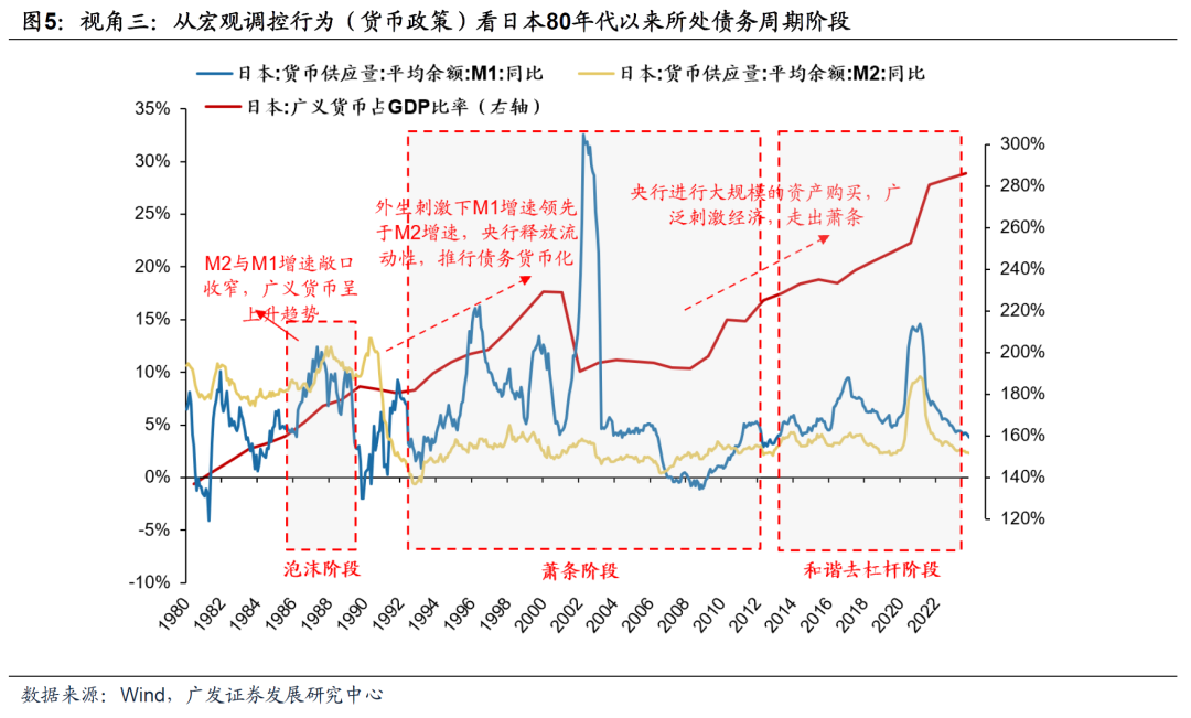 视角三:从宏观调控来看,扩张性财政政策是经济萧条时期平抑经济波动的常见行为,而在经济困难时期往往货币政策宽松以释放流动性(债务货币化),这对于债务化解必不可少。如果货币政策宽松刺激可以抵消通缩性去杠杆力量又不会增加新的债务泡沫,同时达成原有政策目标——经济稳定、通胀温和,最终可以摆脱萧条下的痛苦去杠杆,而进入和谐的去杠杆阶段。