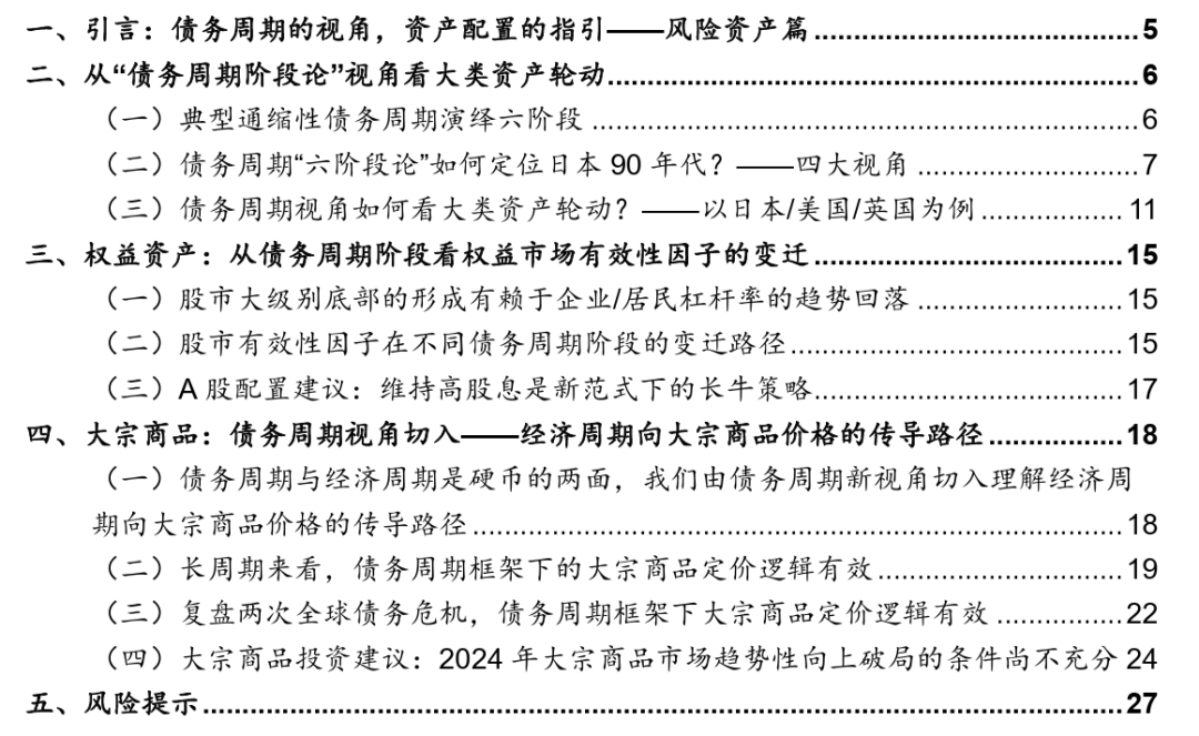 报告摘要 ●资产价格研判的要点“位置”、“边际变化”。在很多最重要的时刻,关于大周期的“定位”往往主导了投资收益的大部分。在溯源海外历史的过程中,我们发现长债务周期的问题是海外大级别下行背后的共同记忆!“债务周期大局观”的系列报告:解读“位置”,正确“应对”来源于此。 ●债务周期的视角,大类资产配置的指引。在“债务周期大局观”的第一篇中,我们侧重债务周期框架的介绍及海外股市大级别下行复盘,并重点分析了股市大级别拐点与杠杆率拐点的关联性。(详见《债务周期下全球股市大底如何形成》);第二篇中我们将债务周期框架重点应用于中日的对比,并依据这一视角分析日本为何陷入失去的三十年?(详见《债务周期视角中日的对比与展望》)。后续我们将会把债务周期的框架继续深入,向读者阐述这一框架对大类资产配置的指引,本篇我们首先聚焦于风险资产,下一篇我们的视角将会转向避险资产。 ●从“债务周期阶段论”视角看大类资产轮动。以日/美/英典型债务周期为例,大类资产表现规律:顶部泡沫破裂&萧条阶段时,债券表现显著占优,股市表现较差;在泡沫阶段与和谐去杠杆阶段,股市相对占优。 ●权益资产:从债务周期框架看,海外股市大级别拐点的形成有赖于杠杆率的见顶并趋势回落。同时以美/英/日本等典型债务周期为例,股市中有效性因子随着债务周期变化形成相似的变迁路径:泡沫形成阶段估值与EPS因子较为有效;进入萧条阶段后,EPS因子有效性显著降低,高股息相对占优;而在去杠杆阶段,股息率与EPS因子有效性会进一步提升,高股息策略在市场长期风险出清的过程中持续占优。 ●大宗商品:债务周期与经济周期是硬币的两面,债务周期的新视角能够帮助我们理解经济周期对于大宗商品的定价的传导逻辑。传统大宗商品价格分析整体遵循 “需求决定方向,供给提供价格弹性”的基本框架 。(1)长周期看:债务周期框架下的大宗商品定价逻辑有效。整体来看,80年代至今美国私人部门杠杆率增速对大宗商品价格有较好的指引。分项来看,美国私人部门杠杆率增速对工业金属&工业原料的指引效果相较于能源更显著。原因是债务周期视角更多提供了大宗商品需求侧的分析框架。而从供给端来看,能源供给的刚性约束一定程度上大于工业金属&工业原料。(2)复盘 20世纪30年代大萧条&2008年全球金融危机,债务周期框架下大宗商品定价逻辑有效。(3)大宗商品投资建议:2024年大宗商品市场趋势性向上破局的条件尚不充分。欧美经济体的需求难以有趋势性向上的增量,国内债务周期下黑色金属相对谨慎。 ● 风险提示:历史经验不代表未来、各国国情差异、海外复盘经验不等同于国内、国内经济不及预期等。