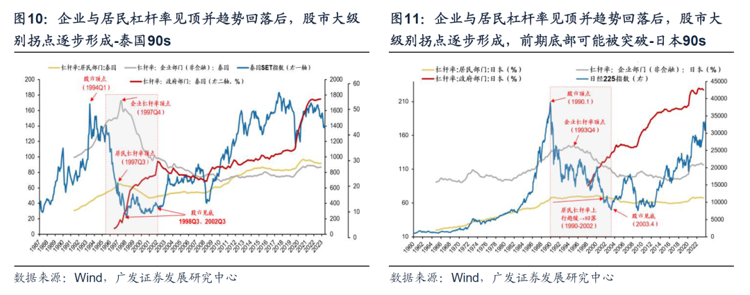 三 权益资产:从债务周期阶段看权益市场有效性因子的变迁 (一)股市大级别底部的形成有赖于企业/居民杠杆率的趋势回落 海外股市历史上大级别底部的形成有赖于杠杆率的见顶并趋势回落。我们在《债务周期下全球股市大底如何形成——“债务周期大局观”系列(一)》曾将债务周期的框架应用于股市拐点的判断,以泰国、美国、日本、德国等历史上的典型债务周期经验来看,杠杆率拐点与股市拐点存在显著关联性:海外股市大级别拐点的形成有赖于杠杆率的见顶并趋势回落,债务风险的消化程度决定市场底部坚实与否。以债务周期的“六阶段论”来看,牛市形成于泡沫之中,大级别底部的构筑则成型于萧条阶段。