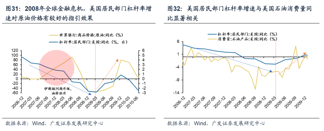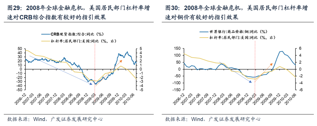 2.2008年全球金融危机 我们在《债务周期下全球股市大底如何形成——“债务周期大局观”系列(一)》详细复盘了2008年全球金融危机的起源:(2004-2006)日益宽松的贷款条件刺激房价的上行,进一步强化债务规模,催生资产泡沫→(2007-2009)货币与信贷环境收紧下泡沫破灭,引发自我强化的经济萧条。 于2008年全球金融危机而言,债务周期框架下大宗商品定价逻辑仍然有效。(2007-2009)债务危机爆发,经济萧条,美国居民部门杠杆率增速回落,大宗商品需求下行/价格受挫;2009年在量化宽松提供流动性、财政政策提供资本金(同期政府部门杠杆率大幅上升)下,美国居民部门杠杆率增速于2009年阶段性重回上行通道,大宗商品需求回暖/价格回升。