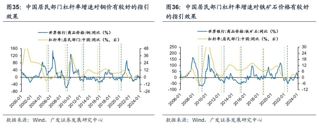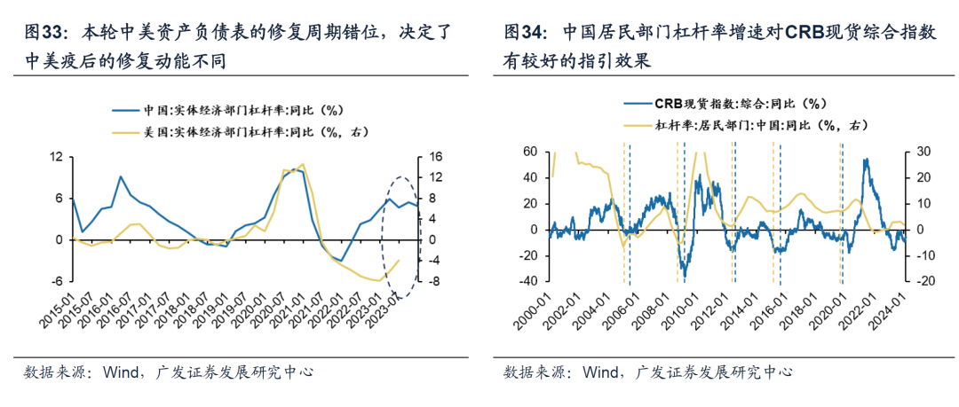 (四)大宗商品投资建议:2024年大宗商品市场趋势性向上破局的条件尚不充分 1.本轮中美居民/企业部门的资产负债表的修复周期错位,决定了中美疫后的修复动能不同。 疫后美国财政对居民和企业做了大量的转移支付,有效修复了企业和居民的资产负债表,因此居民有消费、企业有资本开支,支撑美国经济短期韧性:美国居民在2008年金融危机后后经历了长期的去杠杆,疫情冲击后美国财政补贴下居民资产负债表继续连续呈现改善的态势,驱动疫后的美国消费数据恢复较佳,相对健康的居民部门资产负债表形成浅衰退的“缓冲垫”;美国企业部门在疫情之后收入改善下,并未大幅扩充负债,杠杆率也呈现共振改善,反而驱动疫情之后美国企业迎来了资本开支扩张周期。 而中国虽然穿越了疫情,但是居民部门和企业部门的资产负债表仍待修复——居民消费意愿受影响、企业仍在去杠杆也缺乏大幅资本开支扩张的意愿:从居民端来看,经历了过去2-3年地产信用萎缩和疫情影响,居民的持币意愿上升而加杠杆意愿下降,且经济供给侧的结构发生深远变化影响了潜在的消费意愿;从企业端来看,20年疫后的A股上市公司资本开支扩张是结构性的扩产(以新能源为代表的中游制造是扩产主力军),而在收入下滑、ROE回落的背景下更广谱的行业资本开支意愿不强,与23Q3企业资产负债率下降且优先偿还无息负债率形成互恰,这是疫后相对偏审慎的经营姿态,仍需要时间来恢复企业的加杠杆与扩产能信心。 2.债务周期框架下的大宗商品定价逻辑同样适用于中国市场。2000年以来,中国居民部门杠杆率增速对大宗商品价格同样有较好的指引。近年来,以中国内需主导全球总需求的铜、铁矿石为代表的大宗商品来看,中国居民部门杠杆率增速往往领先铜价同比和铁矿石价格同比增速平均6-12个月。 3. 2024年大宗商品投资建议:大宗商品市场趋势性向上破局的条件尚不充分 供给侧而言:疫情之后,包括地缘政治冲突、逆全球化、绿色转型下传统能源品上游投资不足等因素导致部分大宗商品供给端中长期刚性约束客观存在。 需求侧而言:海外来看,2024年紧缩货币政策的滞后效果仍然可能对于欧美经济构成一定的压力,整体来看2024年欧美经济体的需求难以有趋势性向上的增量。国内来看,当企业部门供给端出现较为显著的结构性变化下,往后需求的适应并非一日之功,这也决定了复苏的“不确定性”。我们判断大宗商品市场缺乏整体性向上的机会,基于国内债务周期的基本情景建议对黑色金属持有相对谨慎态度。