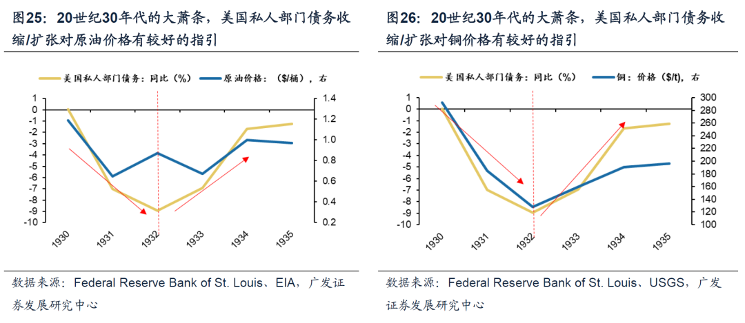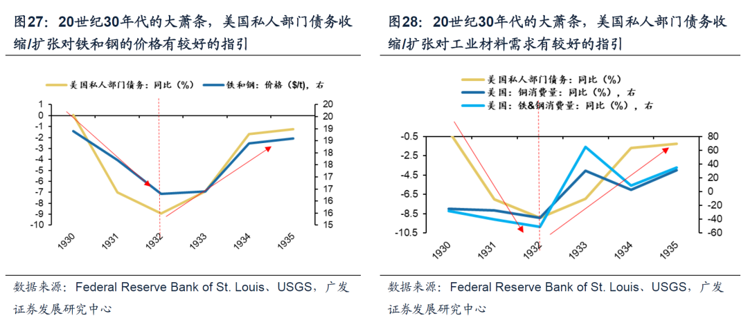 (三)复盘两次全球债务危机,债务周期框架下大宗商品定价逻辑有效 1. 20世纪30年代的大萧条 我们在《债务周期下全球股市大底如何形成——“债务周期大局观”系列(一)》详细复盘了上世纪30年代美国债务危机的起源:债务增长带动经济和投资回报率迅速抬升(1923-1926)→资产价格上行+宽松货币政策,催生资产泡沫(1927-1929)→货币与信贷环境收紧下泡沫破灭,引发自我强化的经济萧条(1929-1932)。 于20世纪30年代的大萧条而言,债务周期框架下大宗商品定价逻辑仍然有效。(1929-1932)债务危机爆发,经济萧条,美国大部分工业都陷入了彻底的停滞,私人部门信贷收缩阶段,大宗商品需求下行/价格受挫;当私人部门信贷规模重新扩张,经济回暖,大宗商品需求回暖/价格回升。