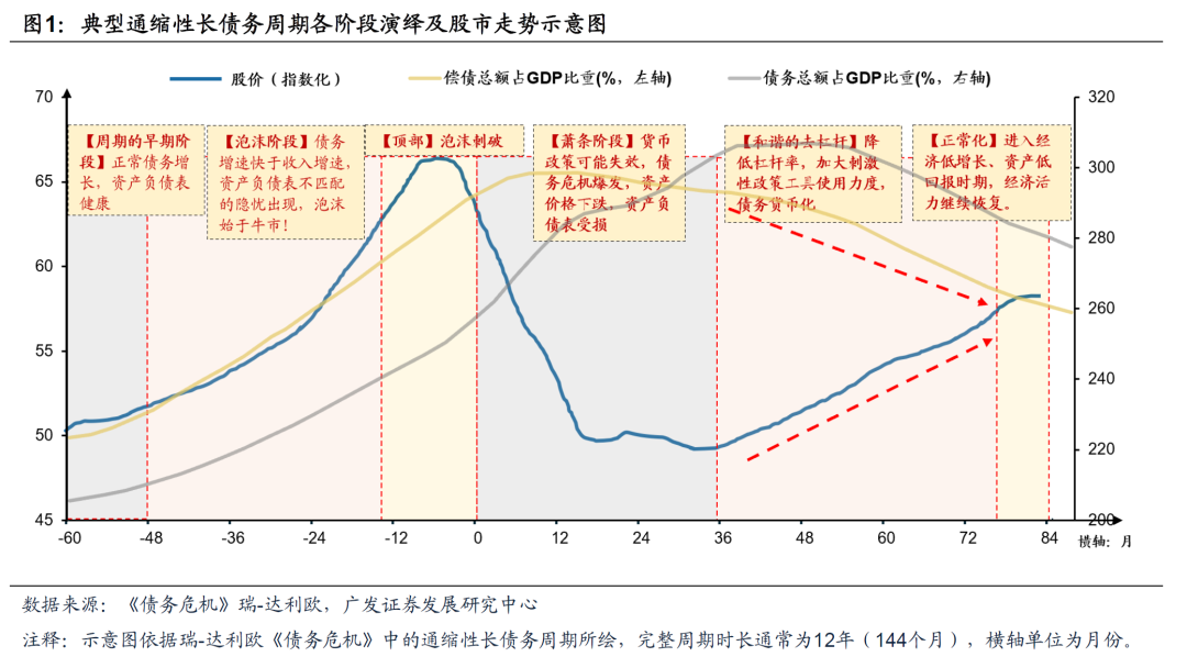 报告正文 一 引言:债务周期的视角,资产配置的指引——风险资产篇 投资,最不应该出现的失误是缺乏“位置感”。大类资产价格研判的两个要点在于“位置”、“边际变化”。我们知道投资者的超额收益来自于认知上的“预期差”,在股市分析中,大多数投资者容易过于依赖“边际变化”,而一定程度上忽视“定位大周期位置”。但我们提示大家:在很多最重要的时刻,关于大周期的“定位”往往主导了投资收益(超额收益)的大部分。而其中的一个关键问题在于我们应该选择哪一个周期作为“坐标轴”去实现“定位”? 在《债务周期下全球股市大底如何形成——“债务周期大局观”系列(一)》中我们提出:纵览全球主流股指的历史,大熊市大多可以归因于“债务周期”,当市场分析聚焦于边际变化本质上是忽视了非周期性因素,容易因此而产生认知偏差。从海外复盘的经验看,在债务周期下,海外股市大级别底部的形成有赖于企业/居民杠杆率的趋势回落;债务风险的消化程度决定了市场底部坚实与否,大级别反转需要债务风险的显著出清。我们关于“债务周期大局观”的系列报告:解读“位置”,正确“应对”来源于此。 在《债务周期视角中日的对比与展望——“债务周期大局观”系列(二)》中,我们将债务周期的框架应用于日本90s的复盘及中日的对比,从债务周期的角度理解日本失去的“三十年”如何发生?比如我们发现日本的汇率政策管理可能不是“核心矛盾”,“债务+人口”问题构成底层逻辑,此外日本宏观政策不协调也客观上延缓经济了走出泥潭。 在本系列的第三篇和第四篇中,我们将会把债务周期的框架继续深入,向读者阐述这一框架对大类资产配置的指引,本篇(第三篇)我们首先聚焦于风险资产(权益资产股市与商品),下一篇我们的视角将会转向避险资产。 对于权益资产股市,我们在此前的报告中已经指出,海外股市大级别拐点的形成有赖于杠杆率的见顶并趋势回落,债务风险的消化程度决定市场底部坚实与否。本篇中我们将进一步聚焦债务周期的阶段论,以美国、英国、日本等典型债务周期为例,权益市场中有效性因子随着债务周期变化形成相似的变迁路径,而高股息策略在市场长期风险出清的过程中持续占优。对于A股而言高股息资产正处于长牛的初期。 对于大宗商品,我们发现债务周期的新视角能够帮助我们理解经济周期对于大宗商品的定价的传导逻辑。传统大宗商品价格分析整体遵循 “需求决定方向,供给提供价格弹性”的基本框架,而债务周期视角更多提供了大宗商品需求侧的分析框架。 同时在本篇中,我们还将从信用周期&资产价格、利率期限结构、宏观调控行为以及“利率黄金法则(Golden rule)”四个角度识别80年代以来日本所处债务周期的具体阶段,这对于我们理解债务周期各阶段大类资产的轮动规律必不可少。 二 从“债务周期阶段论”视角看大类资产轮动 (一)典型通缩性债务周期演绎六阶段 我们在“债务周期大局观”系列的前两篇中参考瑞-达利欧《债务危机》所述,认为典型通缩性长债务周期的演绎可以分为6个阶段:(1)周期的早期阶段:处于债务的正常增长,债务增速不会快于收入增速,债务负担很小,资产负债表较为健康;(2)泡沫阶段:在泡沫初期债务增速快于收入增速,资产回报率与经济增长率快速上扬,资产负债表不匹配的隐忧开始出现;(3)顶部:资产价格受到大量杠杆式买盘推动,杠杆化水平与资产价格过高时,走势逆转的条件已经成熟;(4)萧条阶段:债务违约问题开始爆发,传统货币政策的有效性开始下降,抛售导致资产价值下跌并带来一连串反应,资产负债表受损;(5)和谐的去杠杆:通过资产购买或货币大幅贬值积极推进债务货币化,使名义经济增长高出名义利率,从而带来经济拐点。实施刺激性宏观审慎政策推动高质量信贷增长;(6)正常化:开启经济活力与资本形成的复苏,但这一过程通常经历5-10年才能达到之前的峰值。