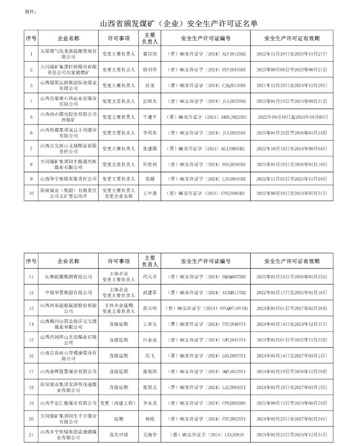 经研究,按照有关规定,为太原煤气化龙泉能源发展有限公司等21座煤矿(企业)颁发安全生产许可证,现进行公告。