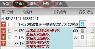 以咏春期权交易软件为例。 点击图1中的“持仓”一栏,选中相应期权合约; 点击“行权”一列中的蓝色加号,弹出行权界面(图2); 选择手数后点击行权或放弃行权按钮。
