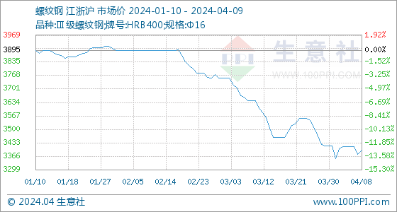 4月9日,生意社螺纹钢基准价为3396.22元/吨,与本月初(3417.78元/吨)相比,下降了-0.63%。