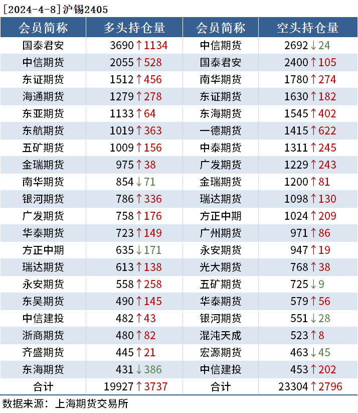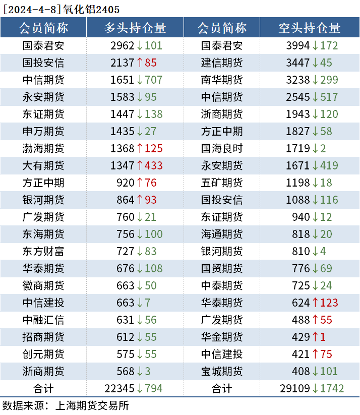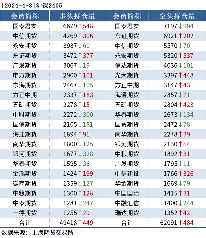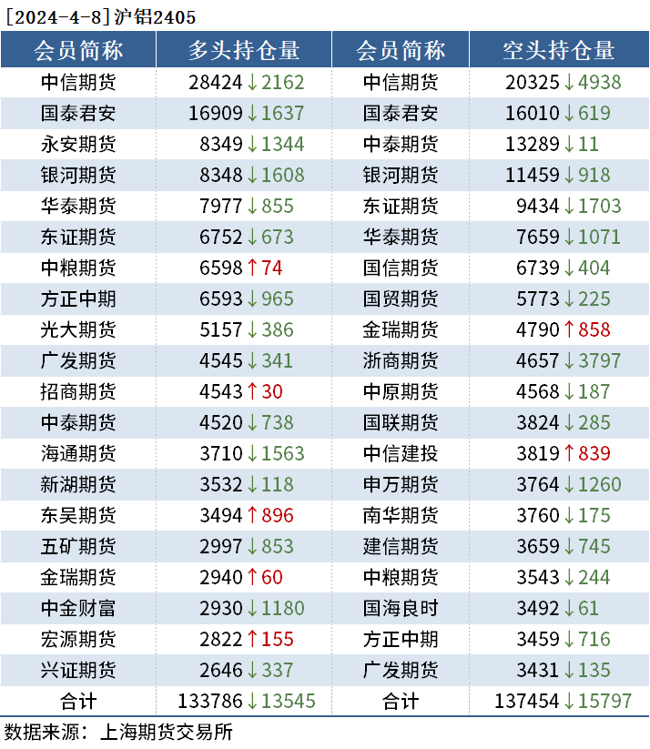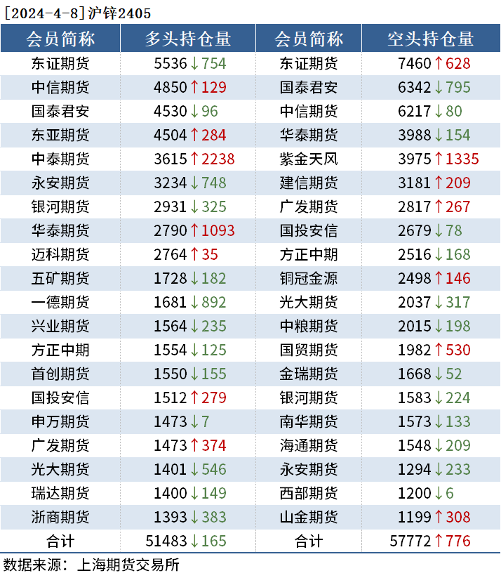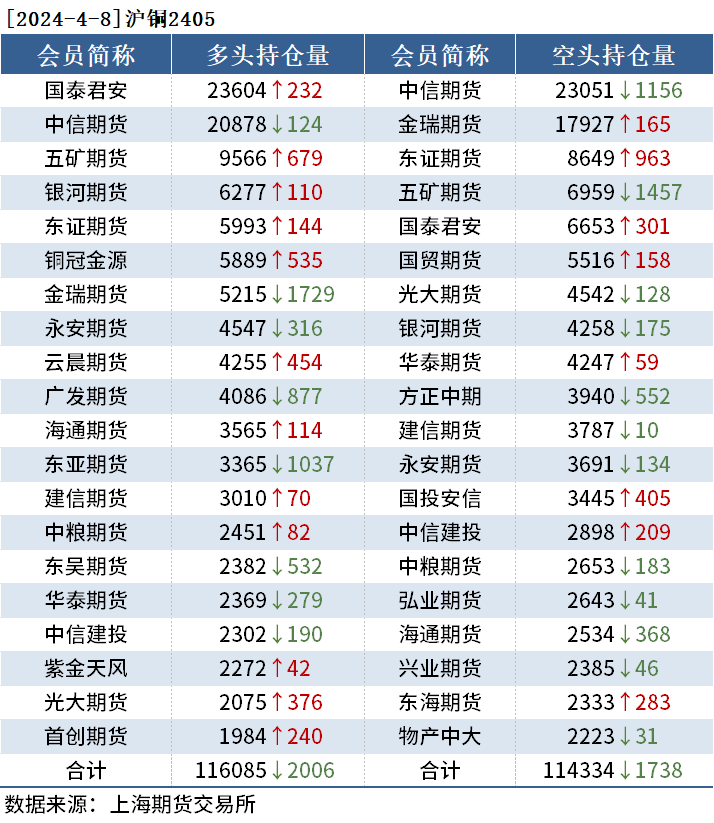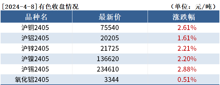 截至4月8日收盘,沪铜2405收75540元/吨,涨2.61%;沪铝2405收20205元/吨,涨1.61%;沪锌2405收21725元/吨,涨2.21%。