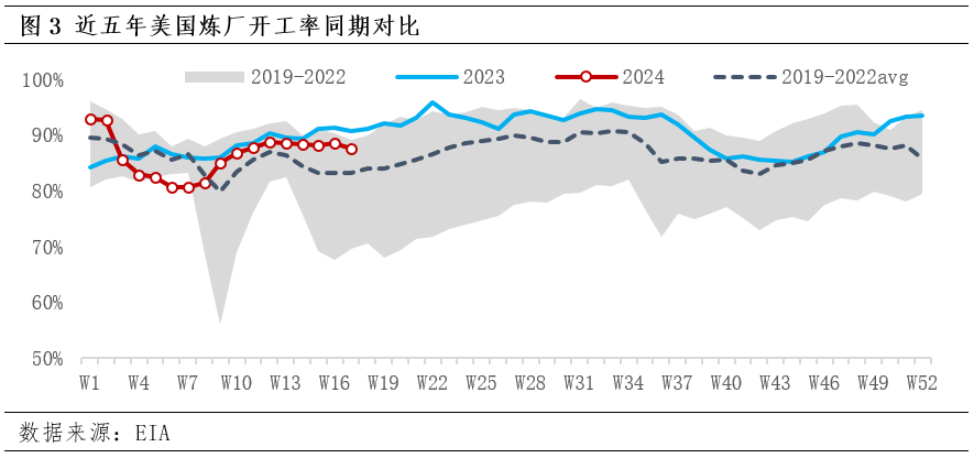 本次库存大增的一方面原因是净进口量的增长。截至4月26日当周,美国商业原油进口677.2万桶,环比增加了27.5万桶,而净进口量增加了153.8万桶至285.4万桶。但单周进出口数据波动较大,对反映基本面变化的参考意义不大。另一方面原因是炼厂开工率进一步回落。从数值来看,截至4月26日当周,美国炼厂开工率降至87.5%,环比前一周下降1个百分点,同比更是下降了3.2个百分点,意味着当前炼厂需求依然平淡。从2019年以来的季节性趋势来看,4月也并非是开工旺季,叠加油价持续处于80美元/桶以上的高位水平,裂解价差环比和同比均下跌,炼厂开工积极性下降。5月到7月开工率或逐渐季节性回升。