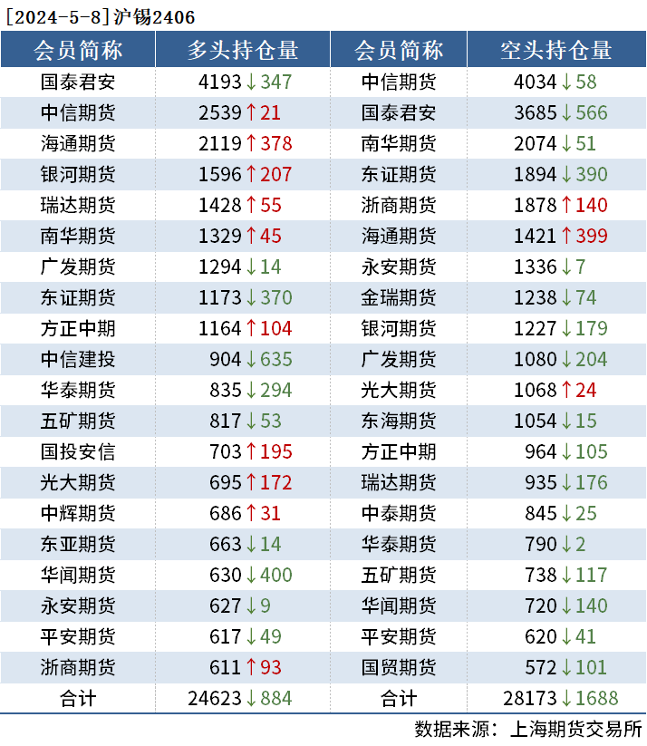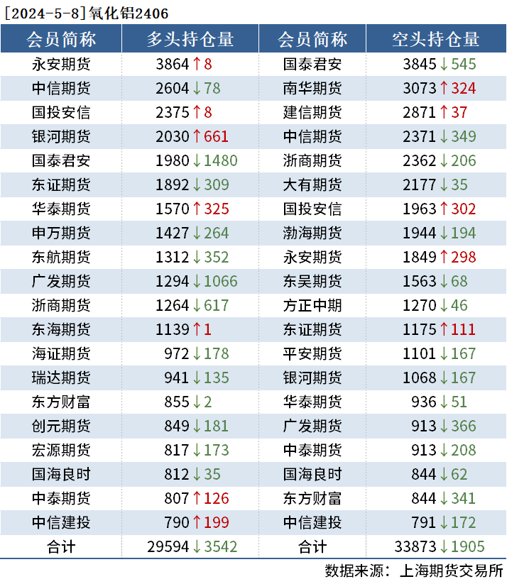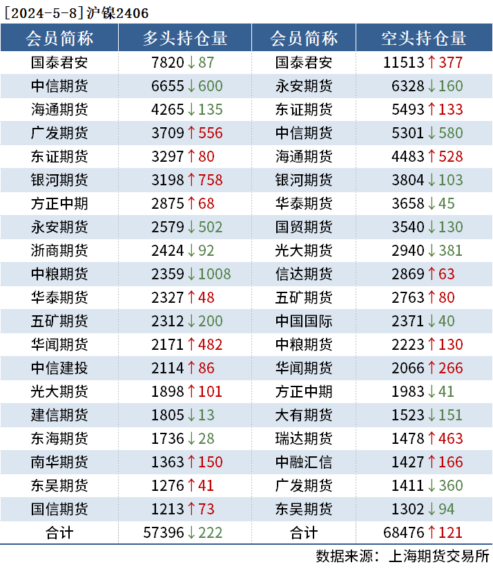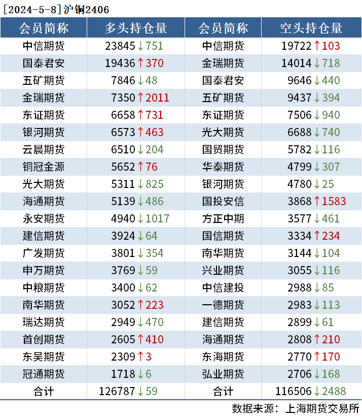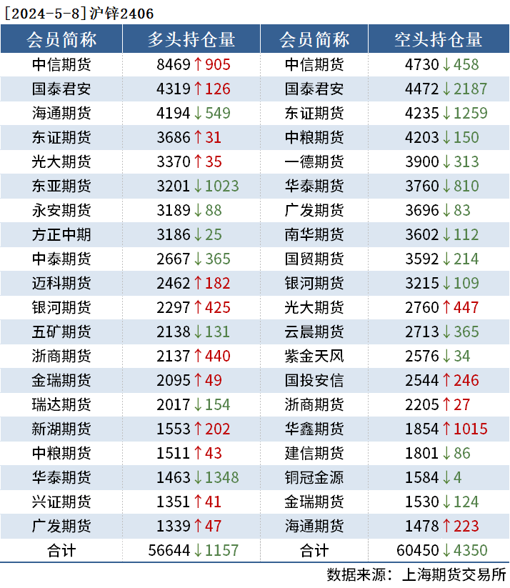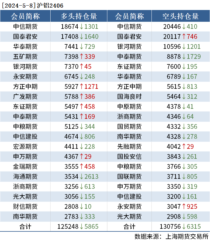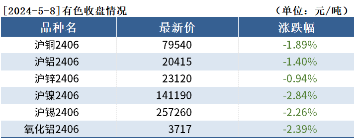 截至5月8日收盘,沪铜2406收79540元/吨,跌1.89%;沪铝2406收20415元/吨,跌1.40%;沪锌2406收23120元/吨,跌0.94%。