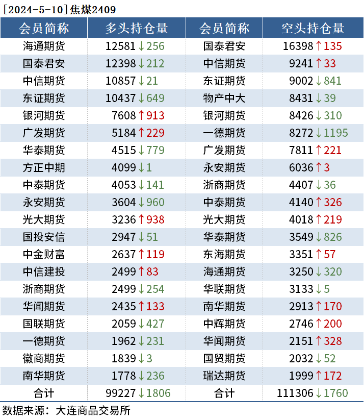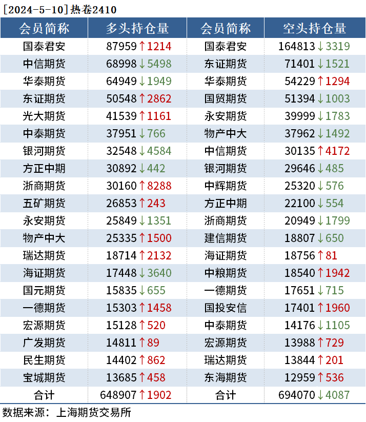 截至5月10日收盘,螺纹钢2410收3662元/吨,跌0.33%;热卷2410收3806元/吨,跌0.05%;铁矿石2409收873.5元/吨,涨0.34%。
