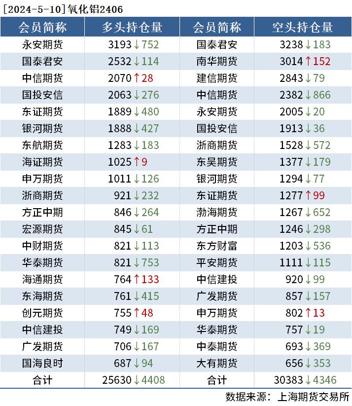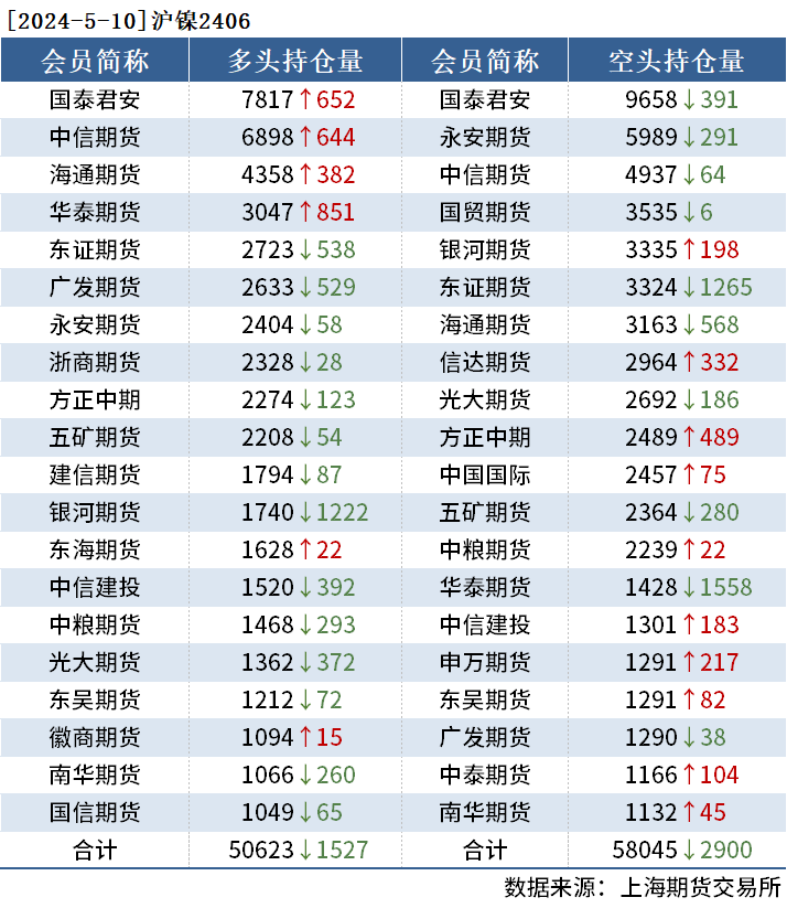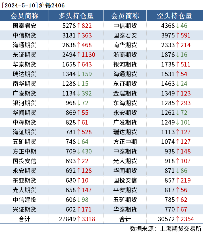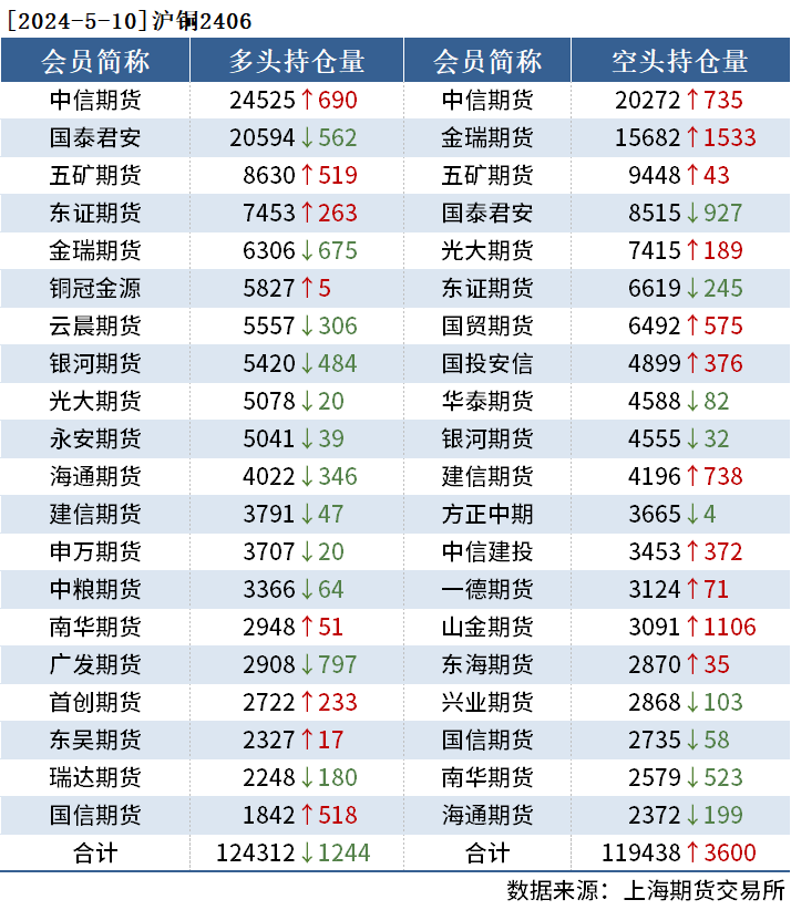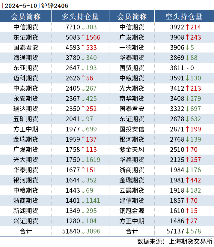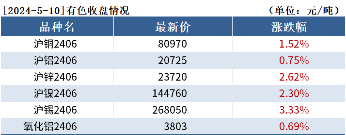 截至5月10日收盘,沪铜2406收80970元/吨,涨1.52%;沪铝2406收20725元/吨,涨0.75%;沪锌2406收23720元/吨,涨2.62%。