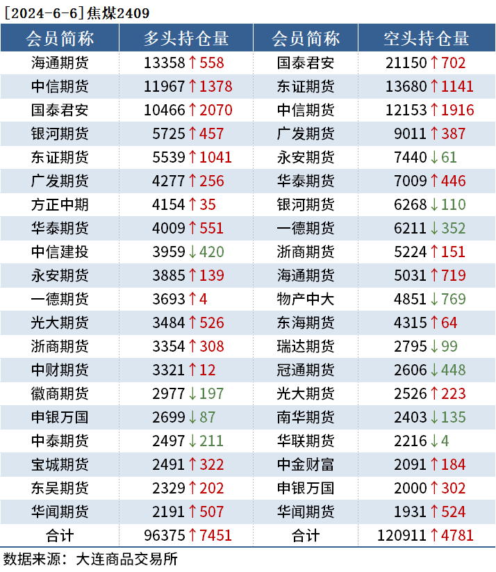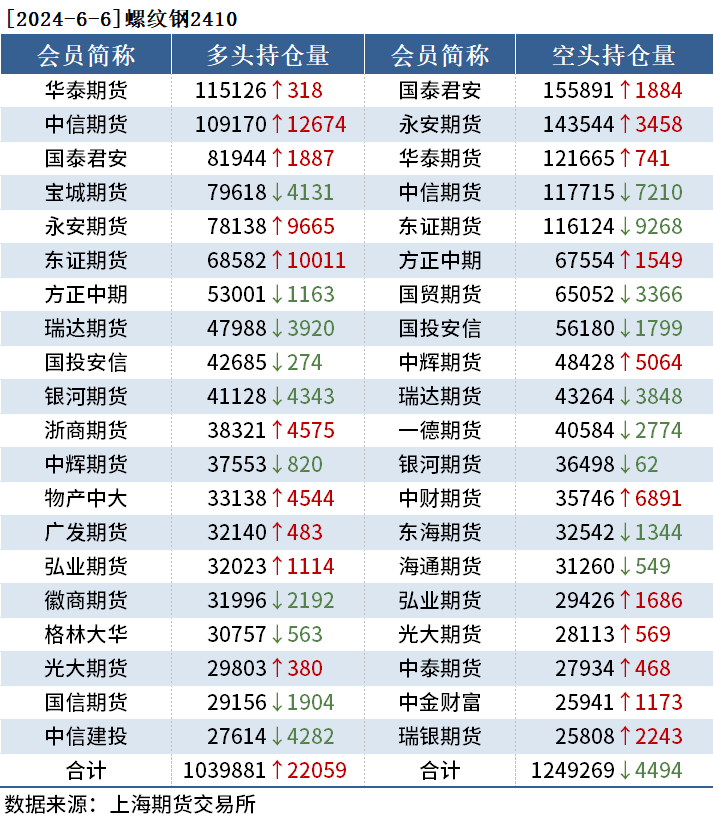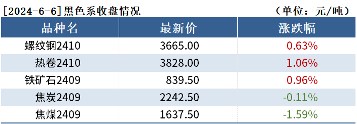 截至6月6日收盘,螺纹钢2410收3665元/吨,涨0.63%;热卷2410收3828元/吨,涨1.06%;铁矿石2409收839.5元/吨,涨0.96%。