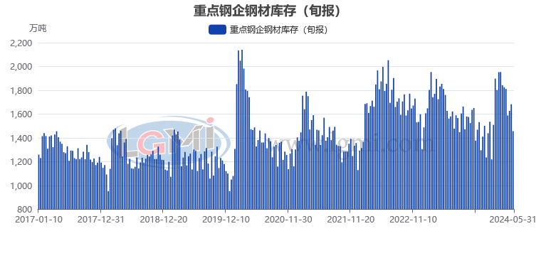 据中国钢铁工业协会统计数据显示,2024年5月下旬重点钢铁企业钢材库存量为1456.69万吨,旬环比减少225.95万吨,下降13.43%;比上月同旬减少131.41万吨,下降8.27%;比去年同旬减少105.38万吨,下降6.75%。