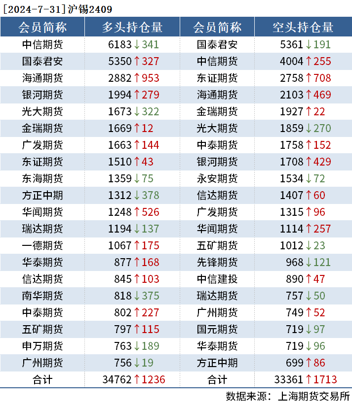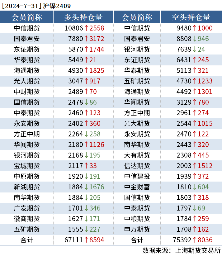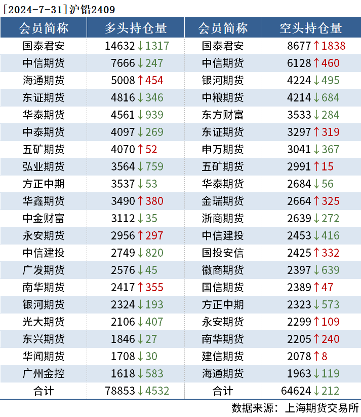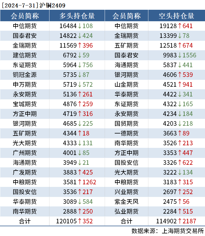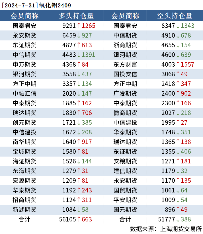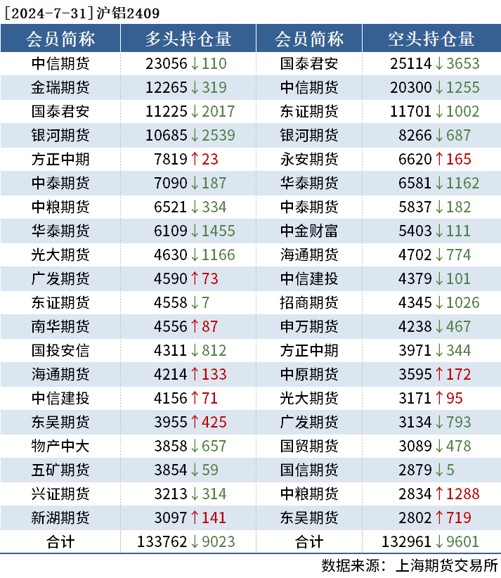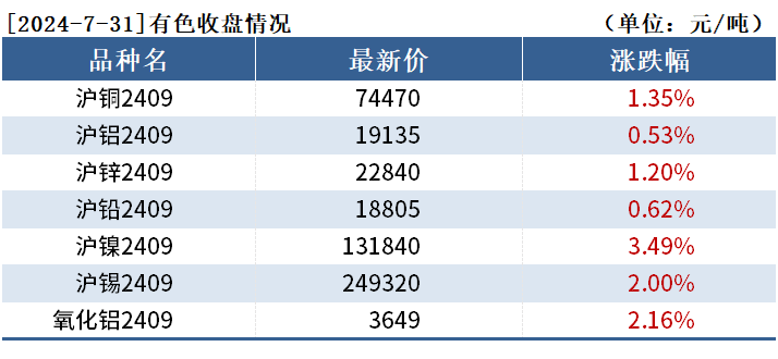截至7月31日收盘,沪铜2409收74470元/吨,涨1.35%;沪铝2409收19135元/吨,涨0.53%;氧化铝2409收3649元/吨,涨2.16%。
