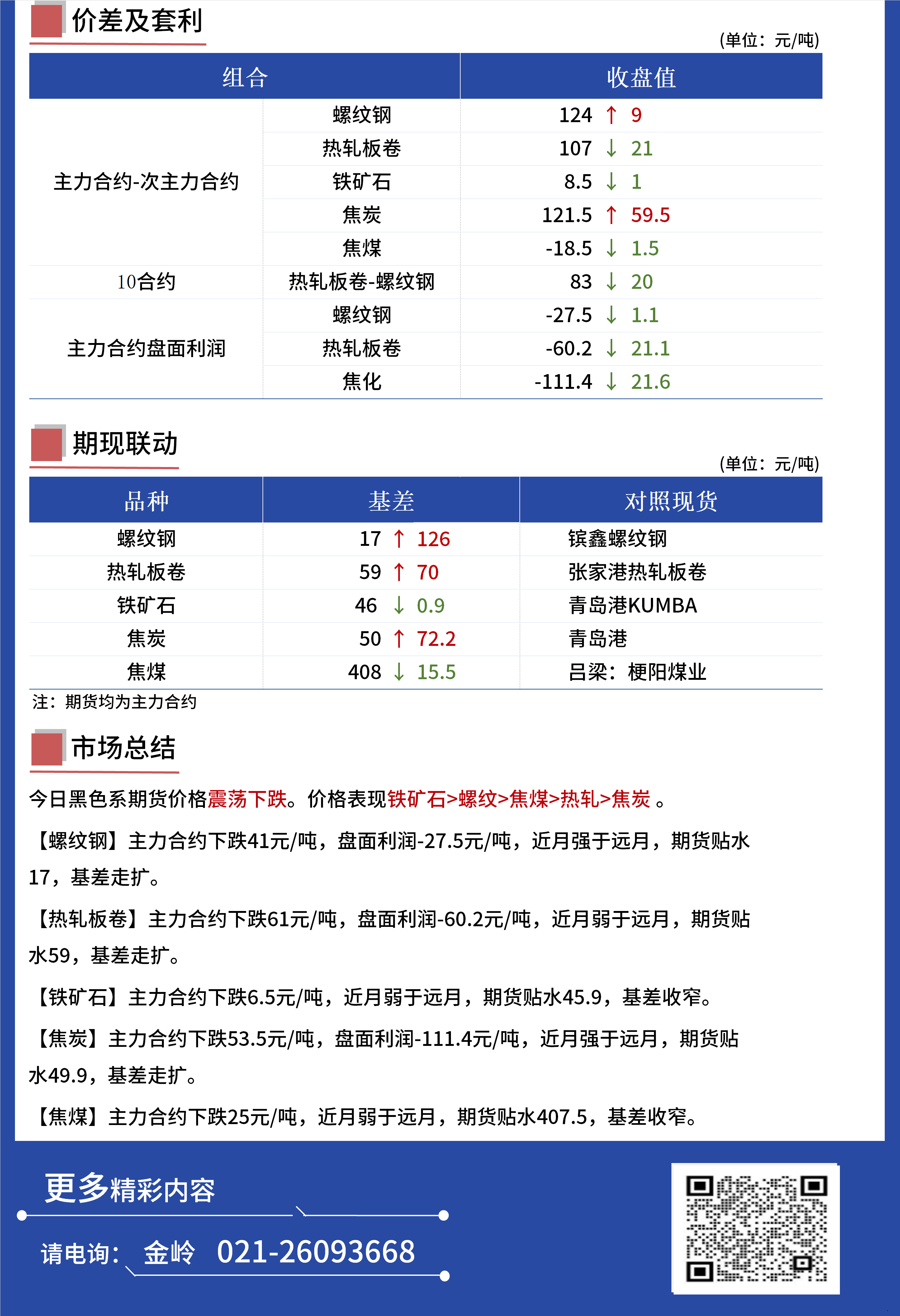今日黑色系期货价格震荡下跌。价格表现铁矿石>螺纹>焦煤>热轧>焦炭 。【螺纹钢】主力合约下跌41元/吨,盘面利润-27.5元/吨,近月强于远月,期货贴水17,基差走扩。【热轧板卷】主力合约下跌61元/吨,盘面利润-60.2元/吨,近月弱于远月,期货贴水59,基差走扩。【铁矿石】主力合约下跌6.5元/吨,近月弱于远月,期货贴水45.9,基差收窄。【焦炭】主力合约下跌53.5元/吨,盘面利润-111.4元/吨,近月强于远月,期货贴水49.9,基差走扩。【焦煤】主力合约下跌25元/吨,近月弱于远月,期货贴水407.5,基差收窄