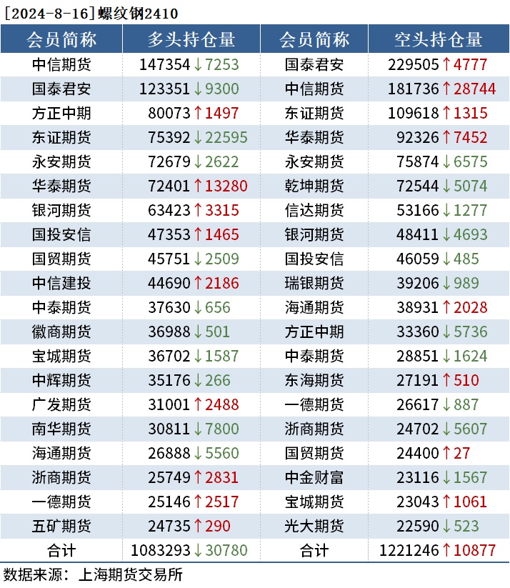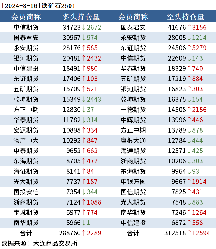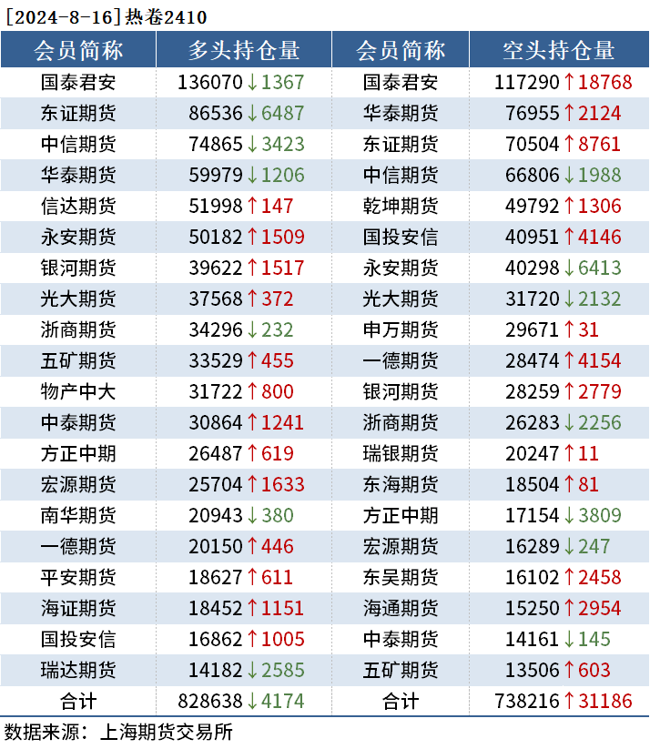 截至8月16日收盘,螺纹钢2410收3078元/吨,跌0.71%;热卷2410收3161元/吨,跌1.80%;铁矿石2501收697.0元/吨,跌0.99%。