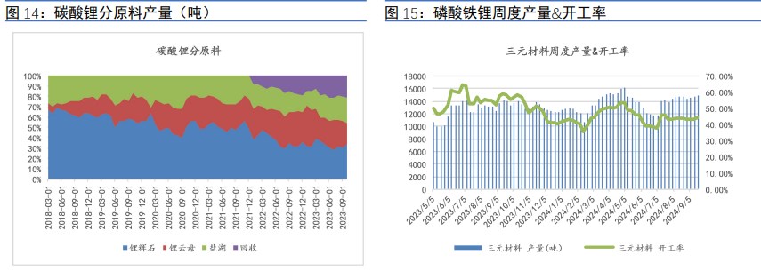锂价低位运行,仍在8 万元/吨以下徘徊,企业产量多数下调。需求端,电池与新能源车产量保持增长态势,新能源车销量小幅增加。据中国有色金属工业协会锂业分会统计,2024 年8月,全国碳酸锂产量约 5.5 万吨,环比下降 0.4%;全国氢氧化锂产量约3.9万吨,环比上升 2.5%;全国氯化锂产量约 1736 吨,环比下降0.3%;全国金属锂产量约 312 吨,环比下降 1.6%。8 月全国锂盐产量折合碳酸锂当量(LCE)约 9.2 万吨,环比上升 0.6%;