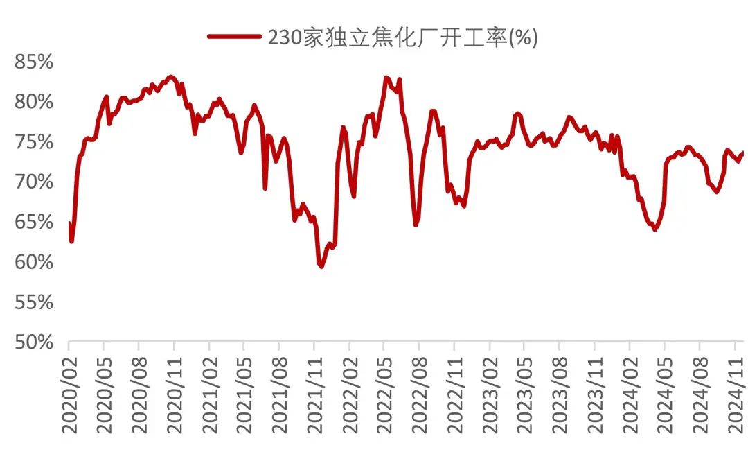 需求:截至11月29日,独立焦化厂炼焦煤库存可用天数11.6天,周变化+0.7天;样本钢厂炼焦煤、喷吹煤库存可用天数分别11.96和12.19天,周变化分别0天和+0.05天。独立焦化厂焦炉开工率73.5%,周变化+0.31个百分点。