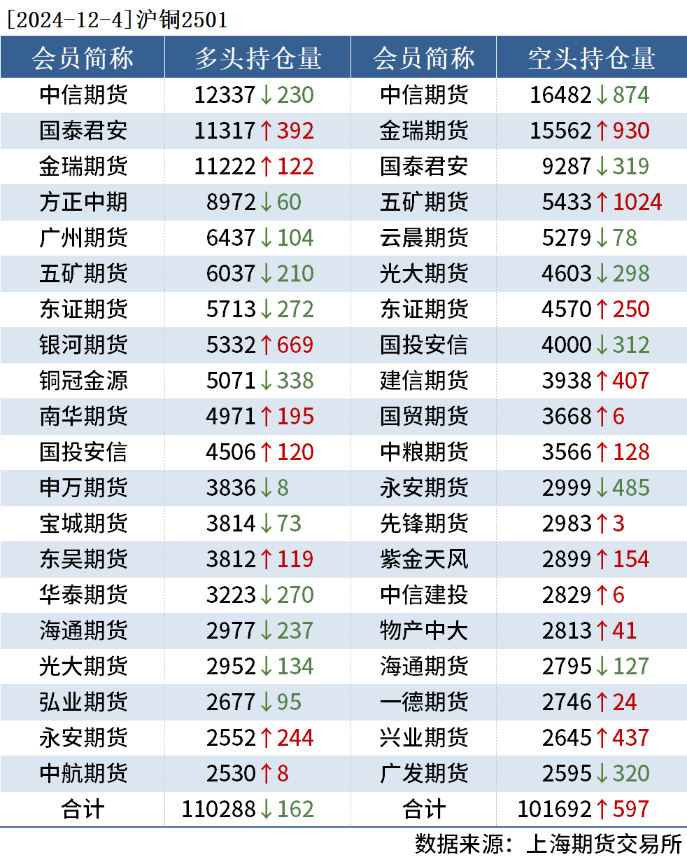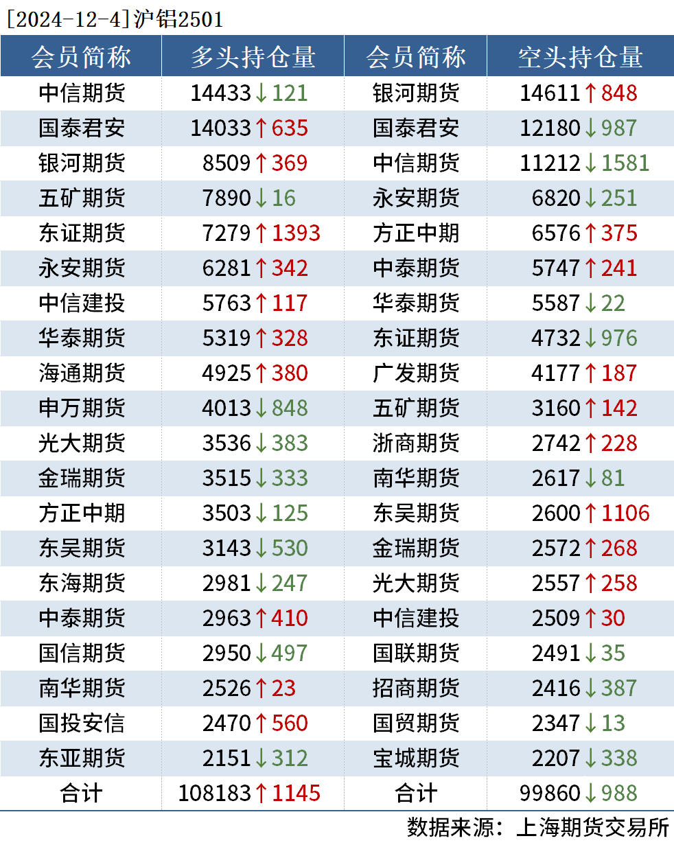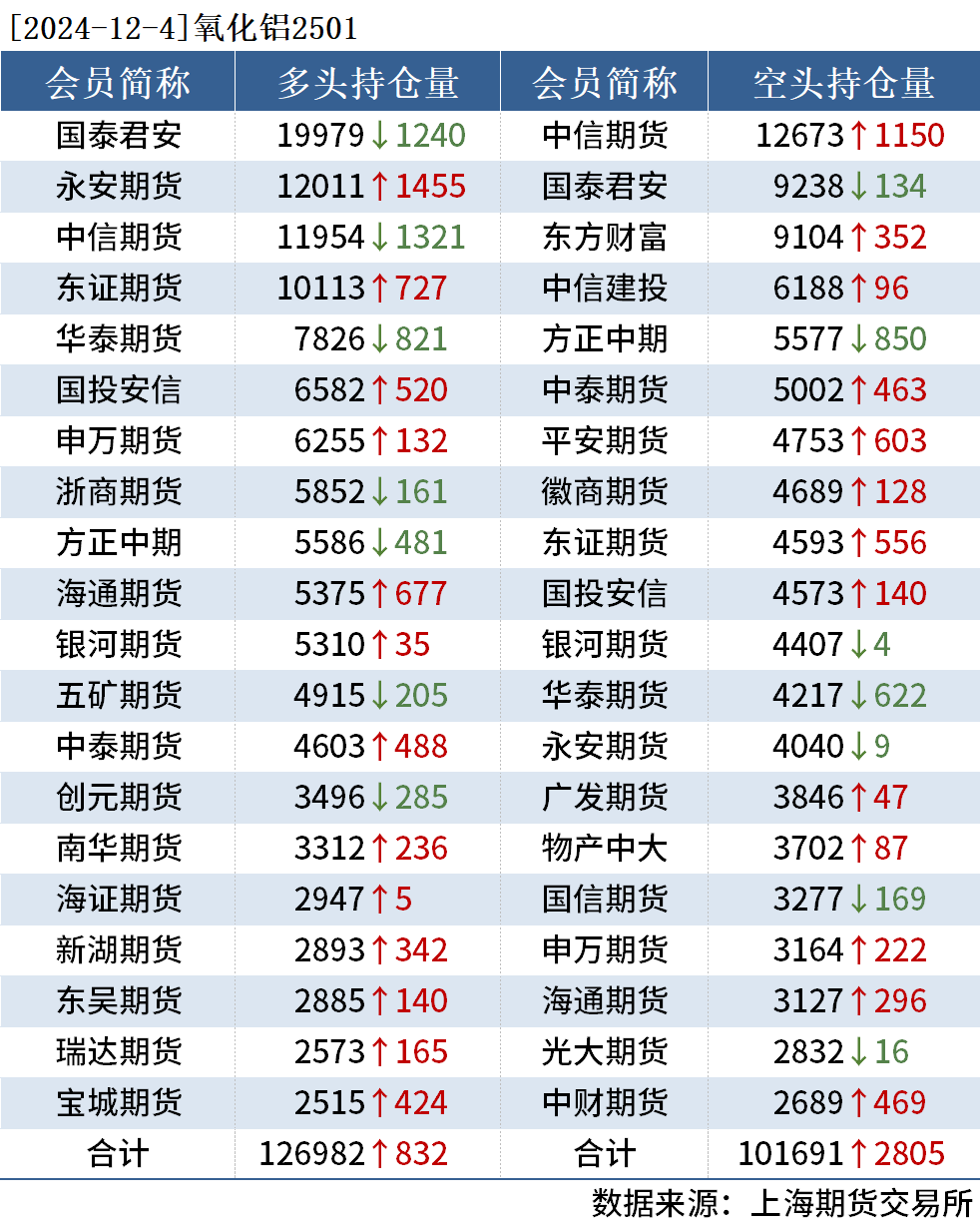 截至12月4日收盘,沪铜2501收74750元/吨,涨0.93%;沪铝2501收20580元/吨,涨0.98%;氧化铝2501收5497元/吨,涨2.52%。