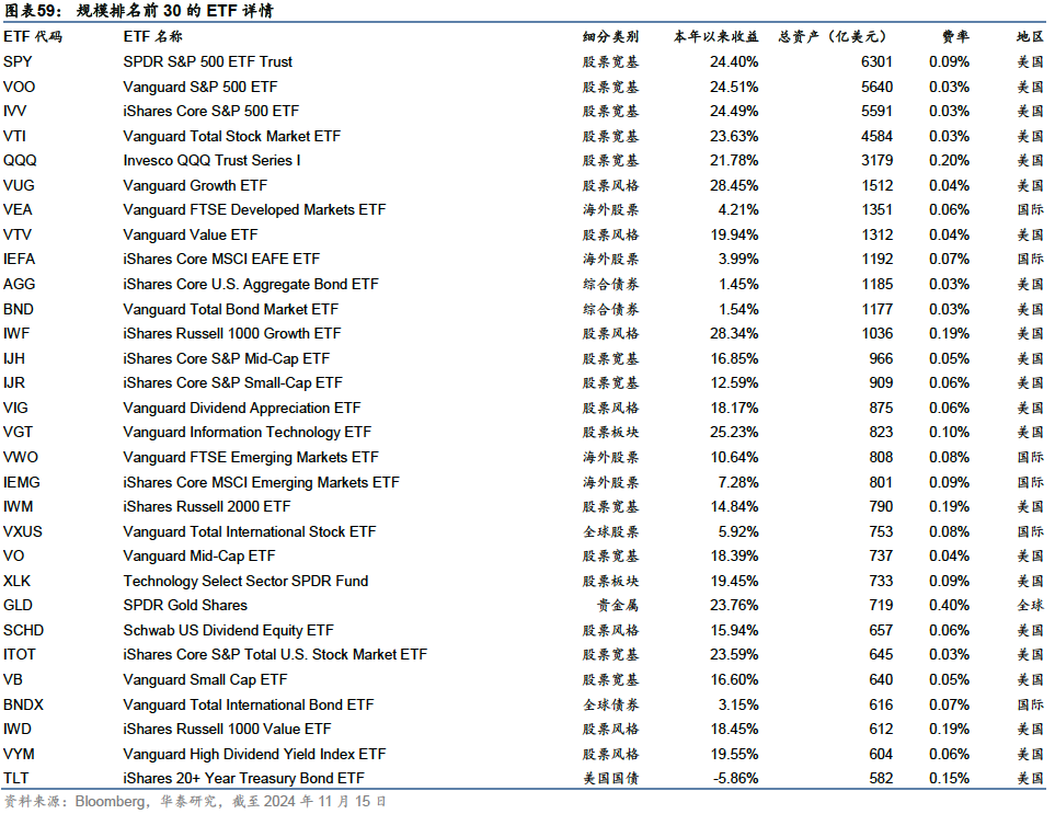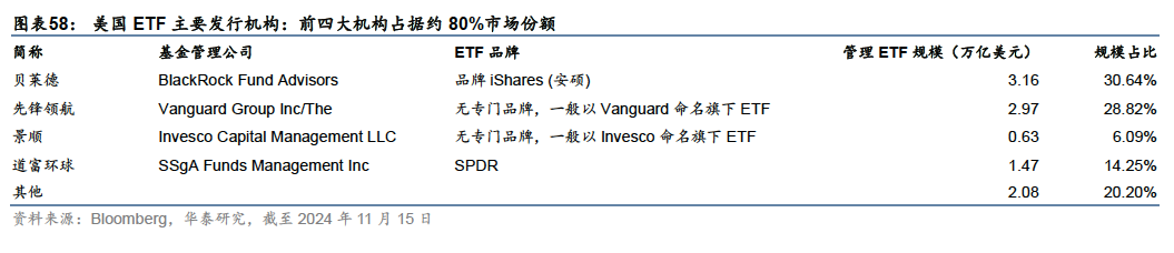 按照ETF管理方式,从规模来看,绝大部分为指数型ETF,截至2024年11月15日,被动规模近9.6万亿美元,占比约92%;近年来新发主动型ETF数量较多,存量数量超1700只,占比约47%,但规模占比仅8%左右。 美国ETF市场的头部集中效应非常明显:3700多只ETF产品中,贝莱德、先锋、景顺、道富四家头部基金公司的产品占据了约80%的份额。规模排名前30的ETF规模达4.73万亿美元,接近全部ETF规模的一半,绝大多数由头部四家基金公司发行。